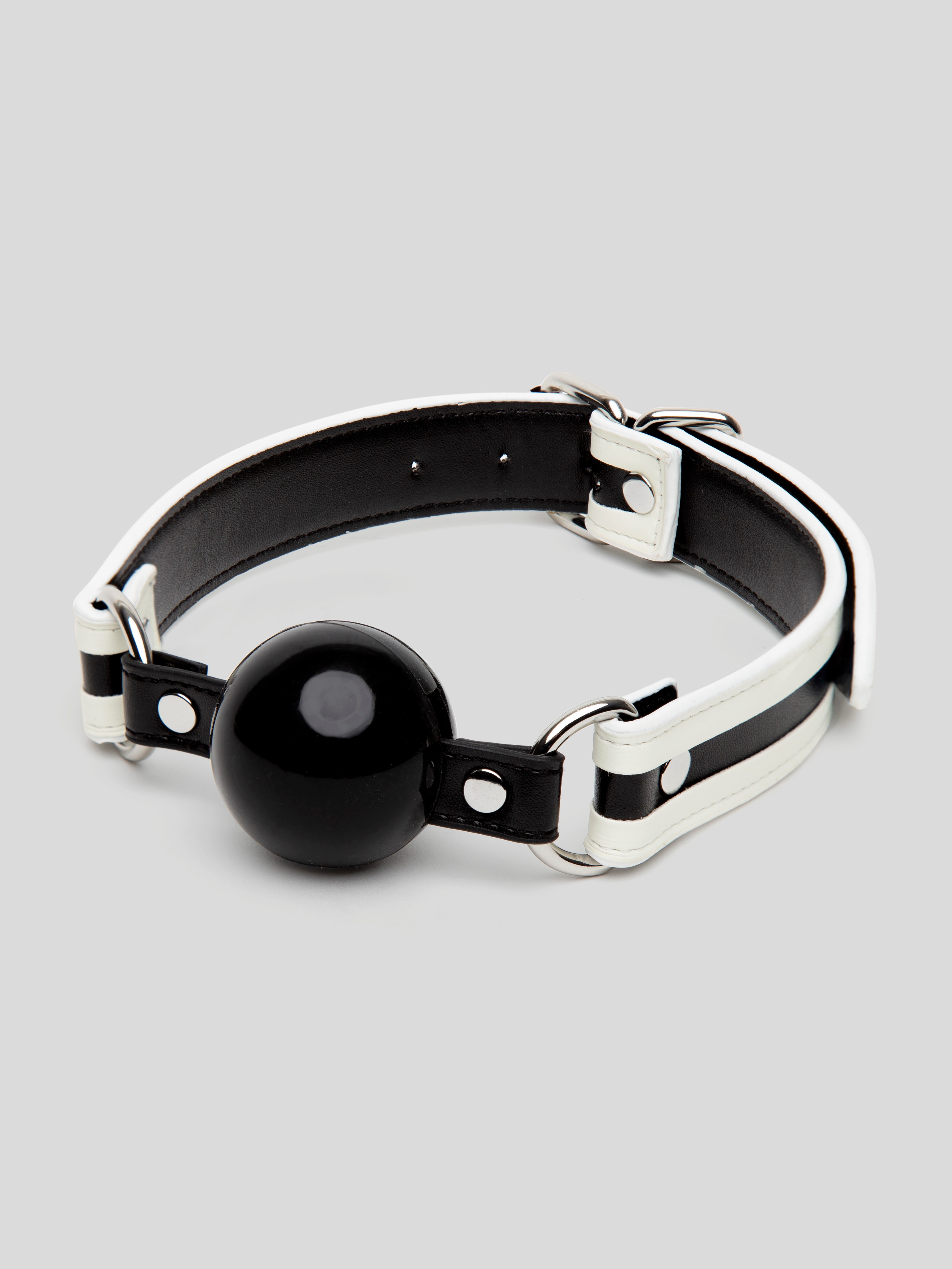 - Faux leather glow-in-the-dark ball gag to silence your sub during BDSM play