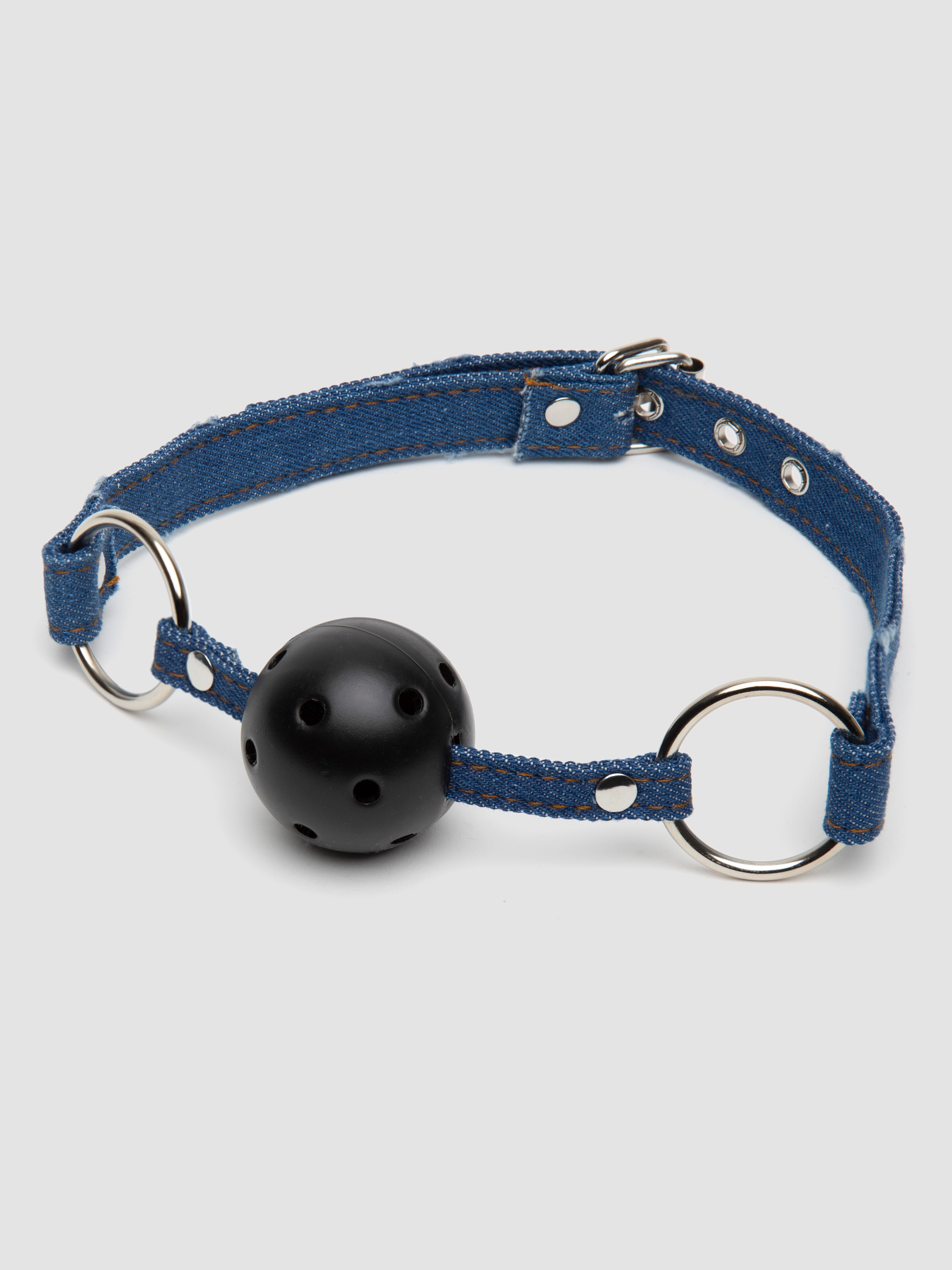 You and your fave sub will have a ballin' time with this stylish distressed denim ball gag. With five holes for easy breathing, the gag fastens with a metal buckle, and the O-rings to either side of the gag offer plenty more restraint options.