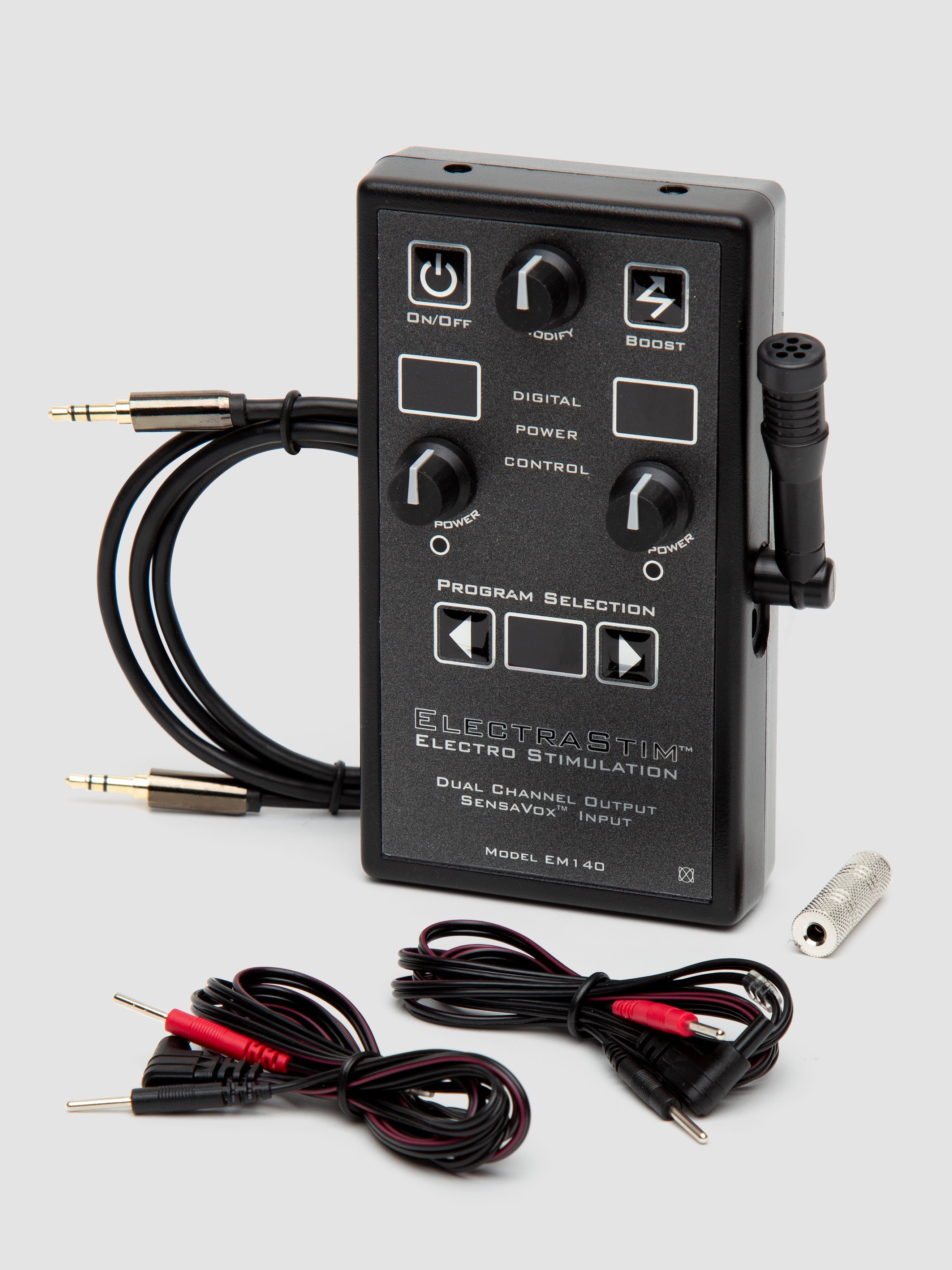 EM140 SensaVox is the ultimate in electrosex play for couples. Dual channels with individual controls allow you to use up to 4 uni-polar or 2 bi-polar sex toys. The unit can even be controlled by music or your voice and operates via mains or battery power.