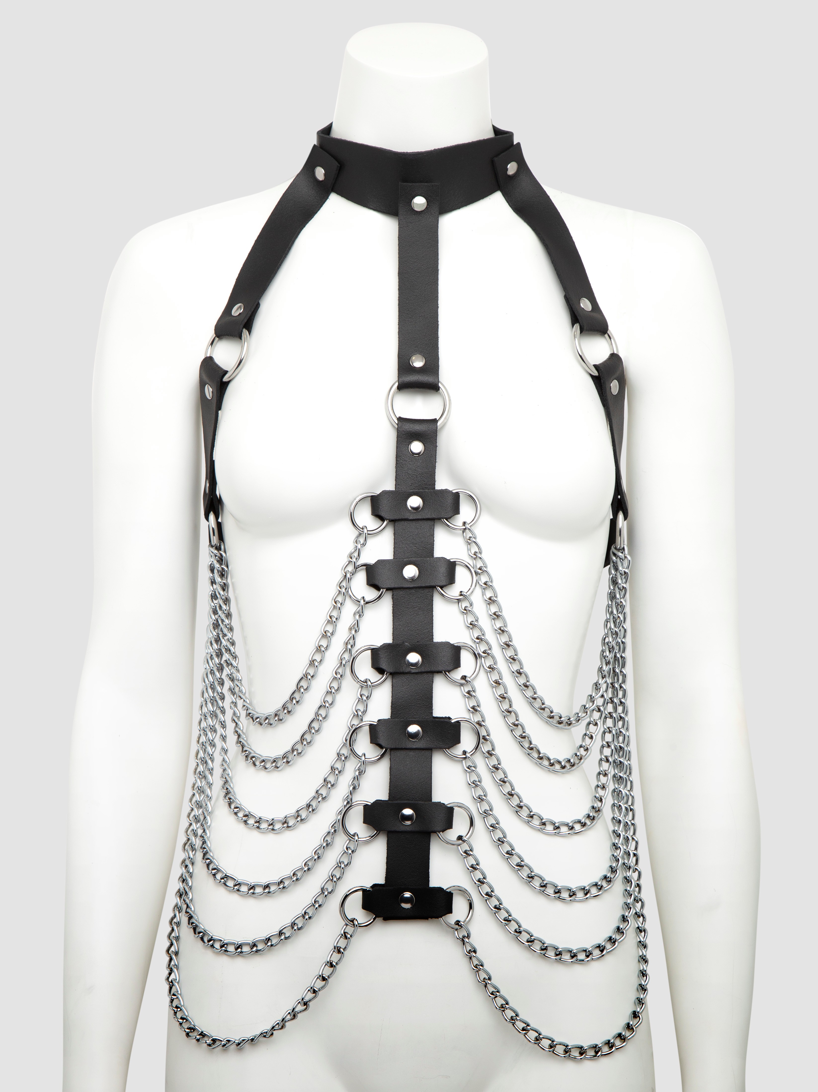 The central strap boasts a large O-ring, perfect for attaching restraints or leads to, plus six smaller O-rings on either side attached to a total of 12 cold, hard chains. Meanwhile, your nipples are free for clamps... or maybe tassels or pasties.