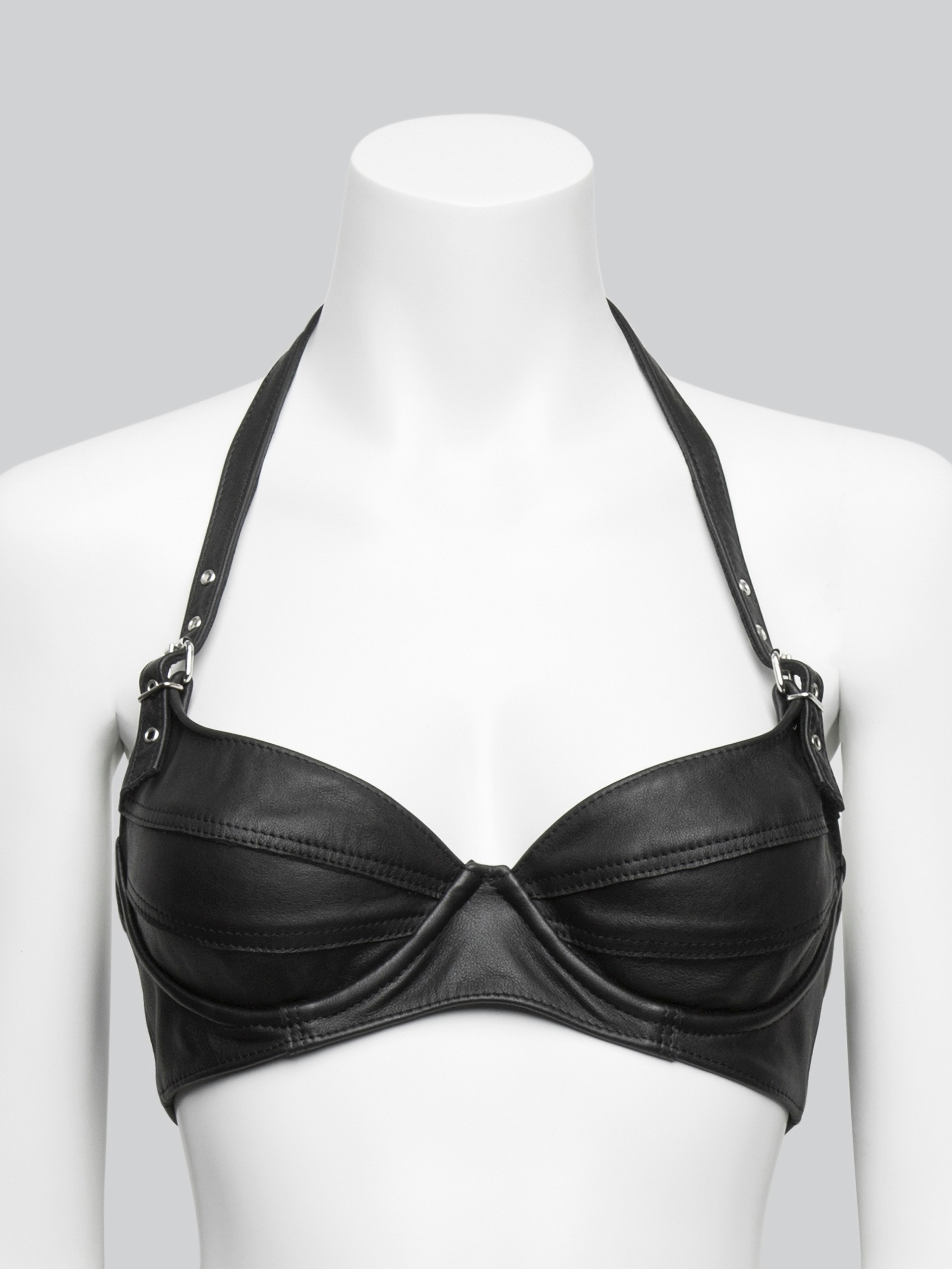 Go full animal in this stunning, soft matt leather bra. Boasting an adjustable buckle back strap and shining metal eyelets to match, it amplifies your assets thanks to supportive underwiring and a super-flattering, boob-lifting buckled halterneck.