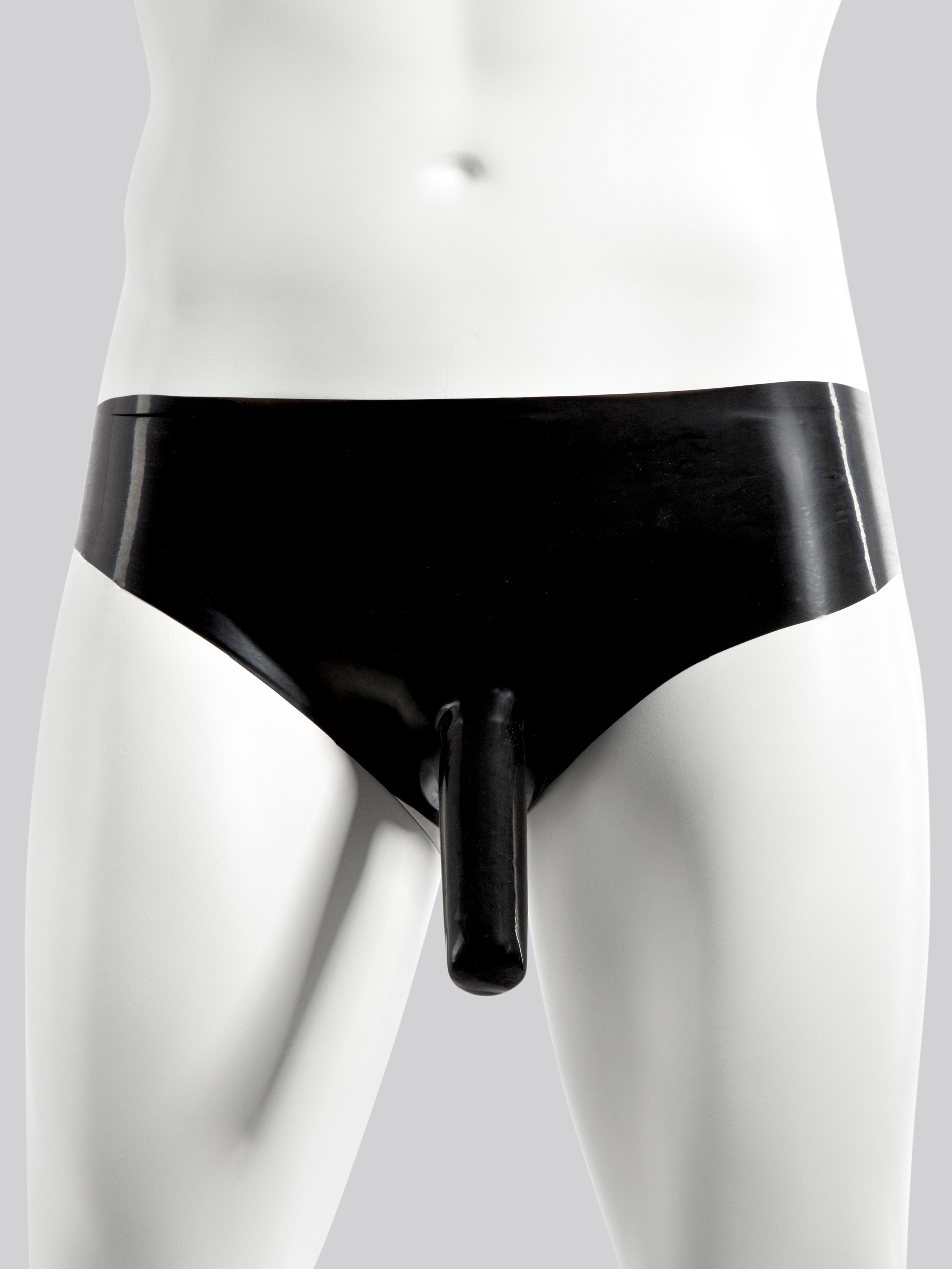 - Moulded black latex men's briefs with penis sheath for restrictive sensations
