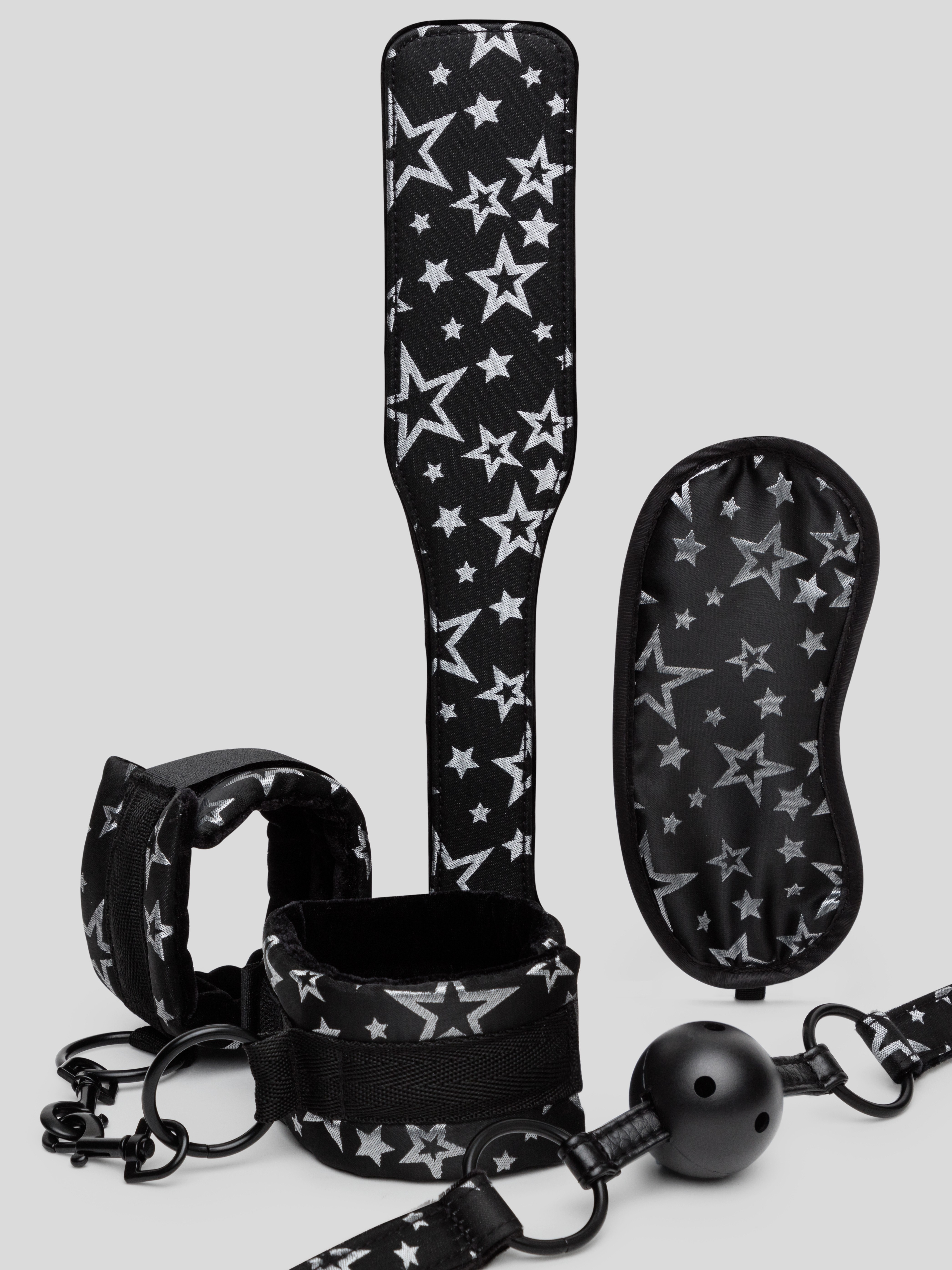 Turn your next bondage session into a star-studded party and surprise your OH with this dazzling four-piece bondage set. Including an adjustable ball gag, handcuffs, spanking paddle and matching blindfold, it has all you need to get started.