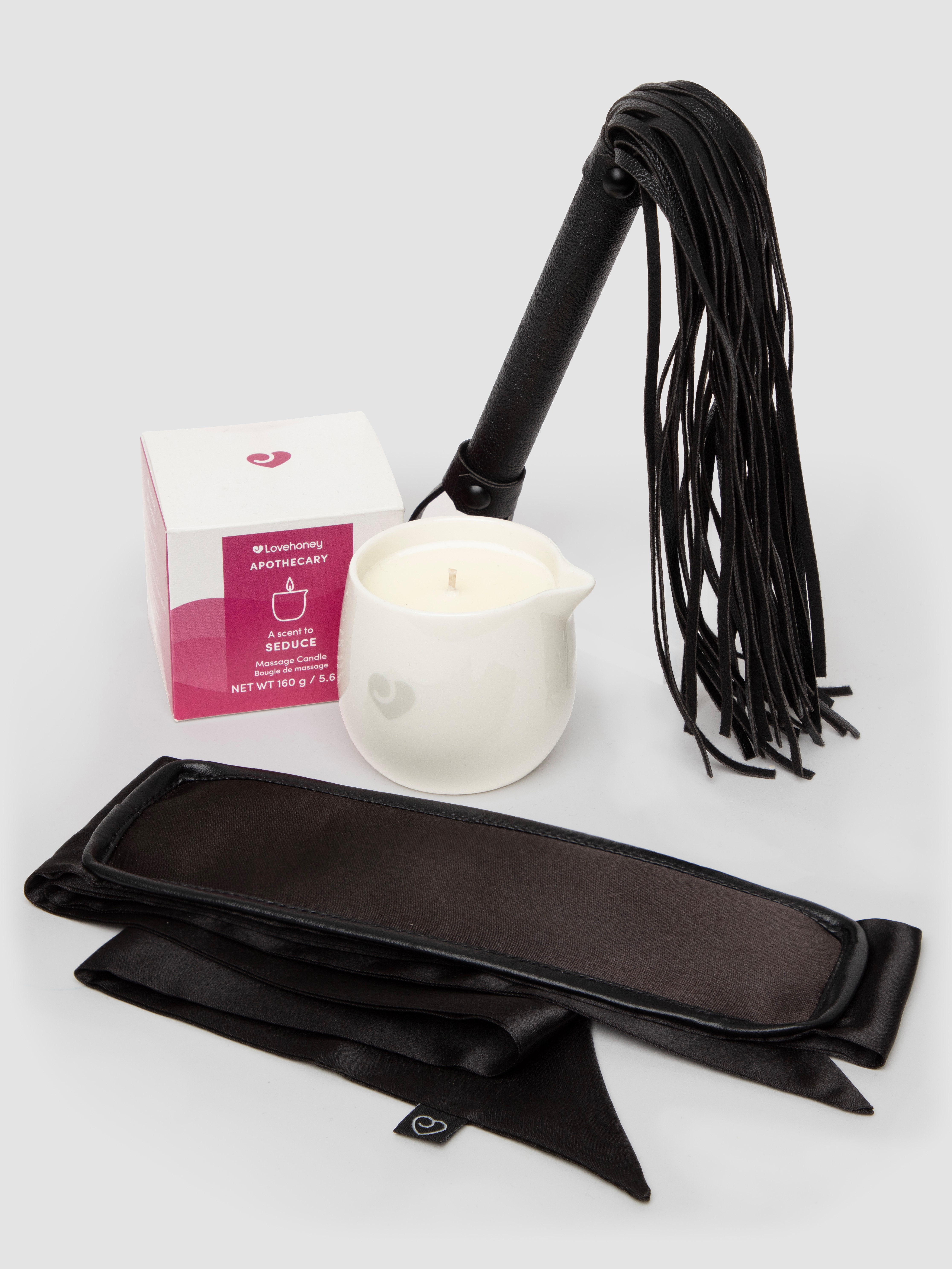 Discover a whole new world of sensation with this seductive three-piece bundle. Featuring a scented massage candle, a silky black blindfold, and a faux leather flogger - this tantalising set is sure to bring you and your lover even closer.