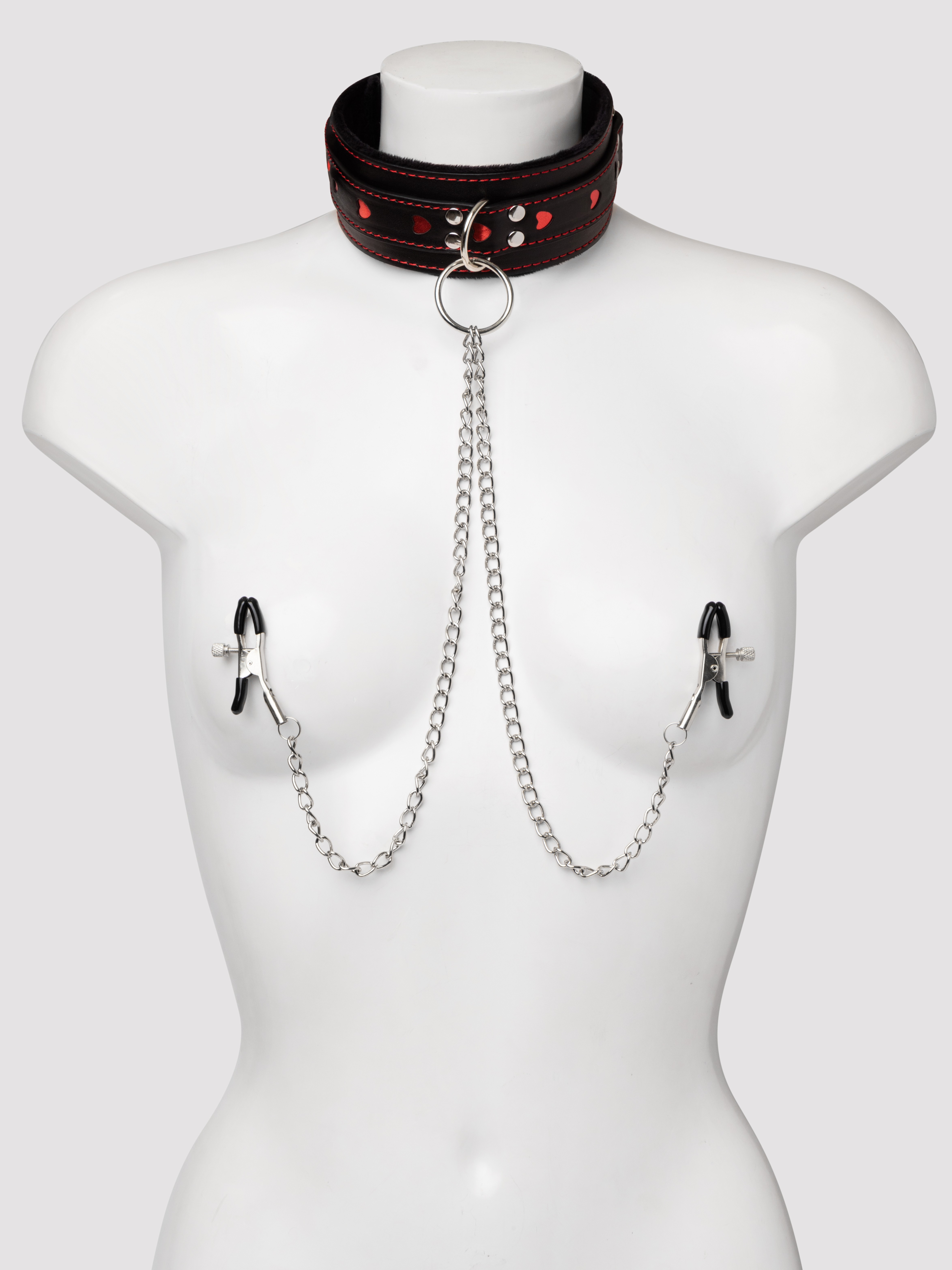 - Faux leather heart-patterned collar with nipple clamps and chain for premium bondage play
