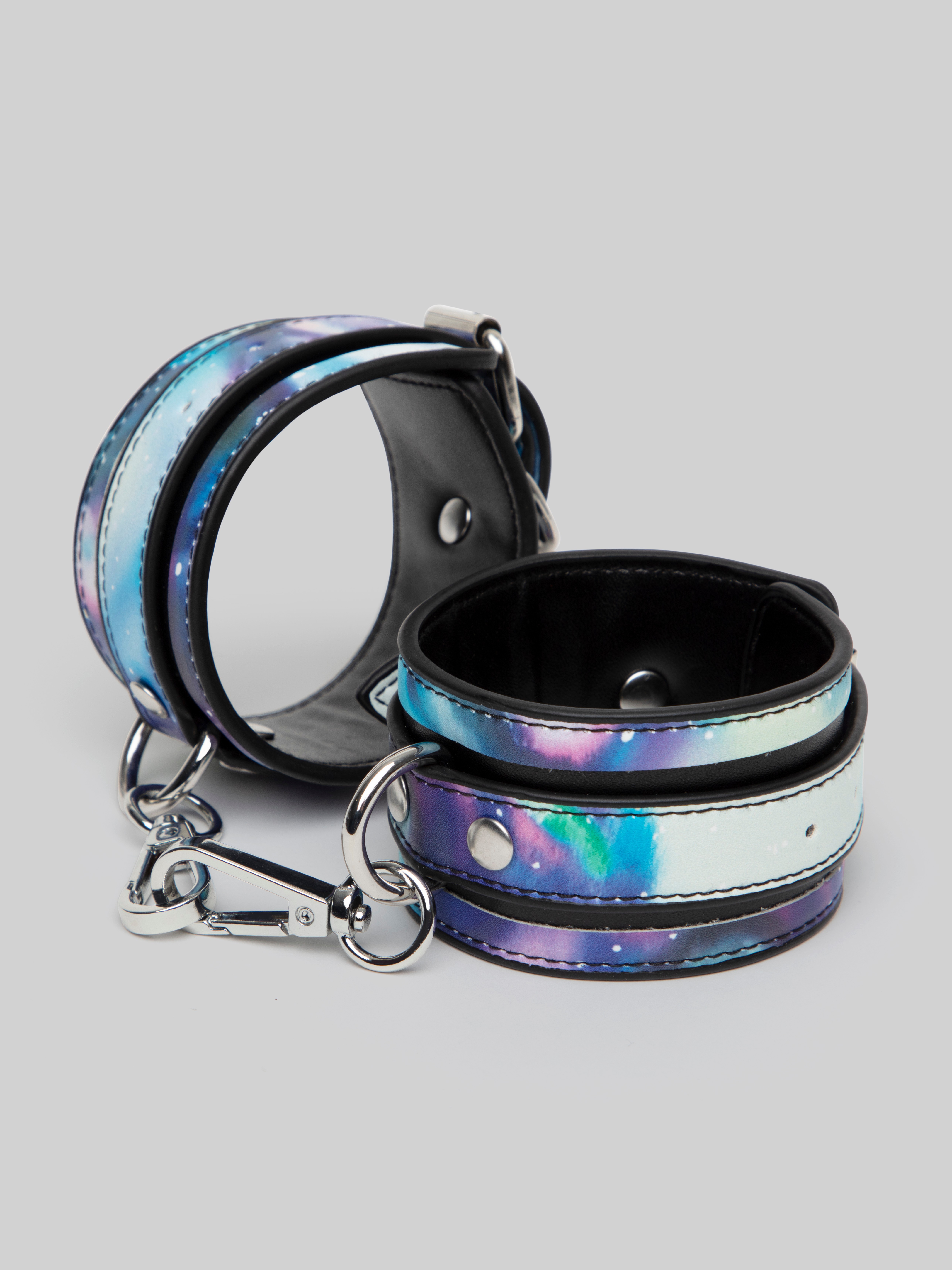 The sky's the limit with these cosmic print faux leather wrist cuffs. Blooming with blue and purple hues and featuring shining metal hardware, these restraints will get you all starry-eyed, taking your bondage fantasies right out of this world.
