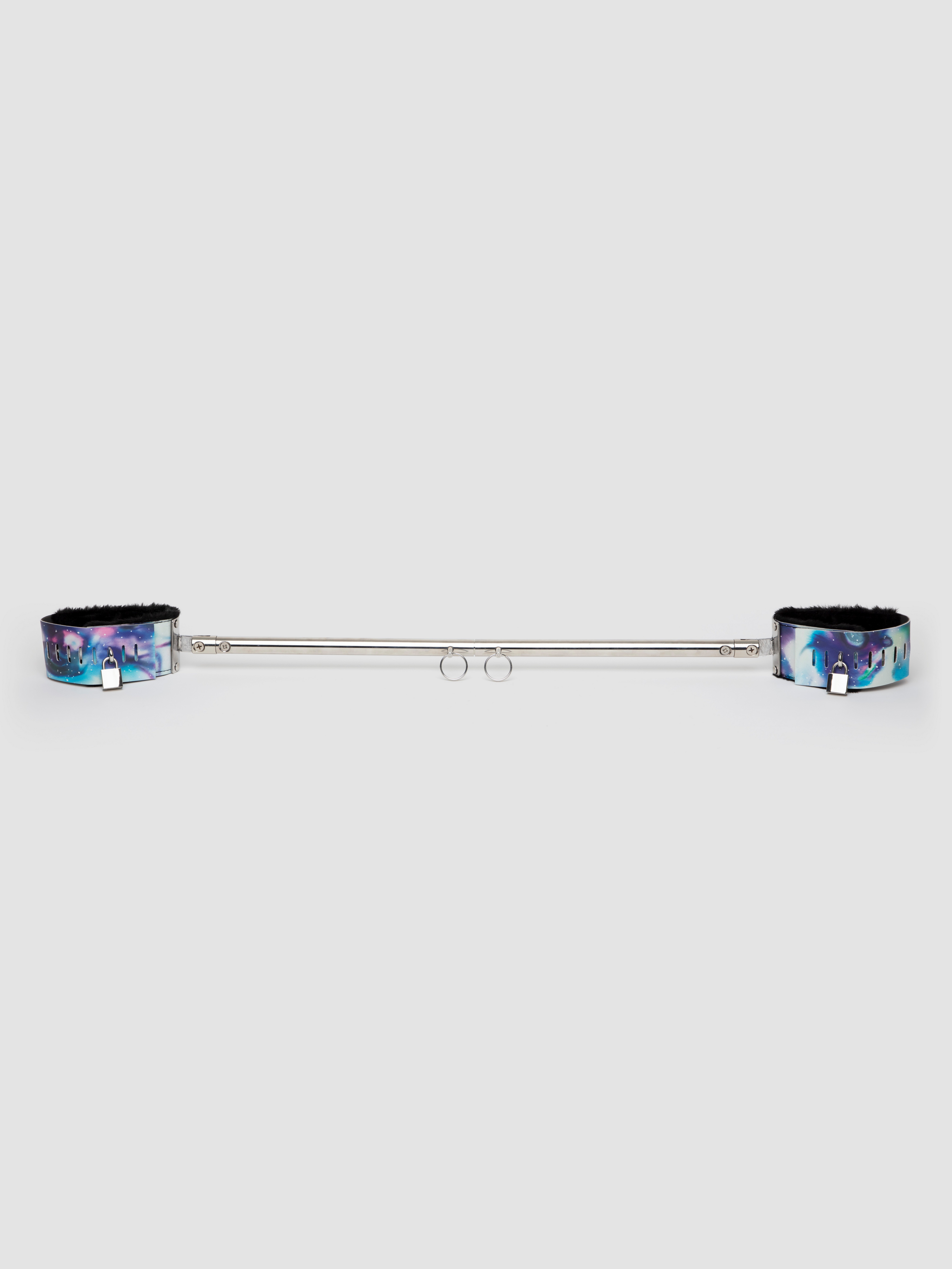 The sky's the limit with this cosmic print spreader bar with faux leather wrist cuffs. Blooming with blue and purple hues and featuring gleaming metal hardware, it will get you all starry-eyed, taking your bondage fantasies right out of this world.