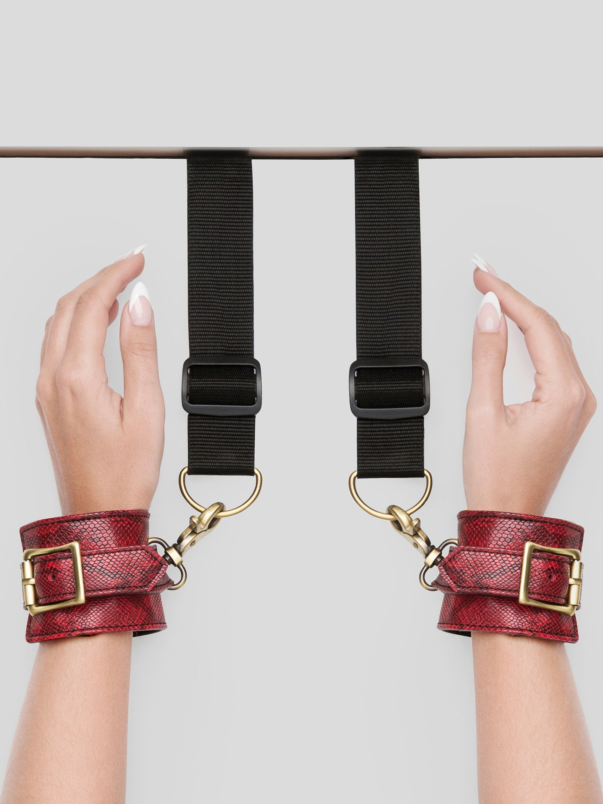 With crimson faux snakeskin, brass hardware and durable strapping, these over-the-door cuffs offer sexy bondage sex while standing in any home.