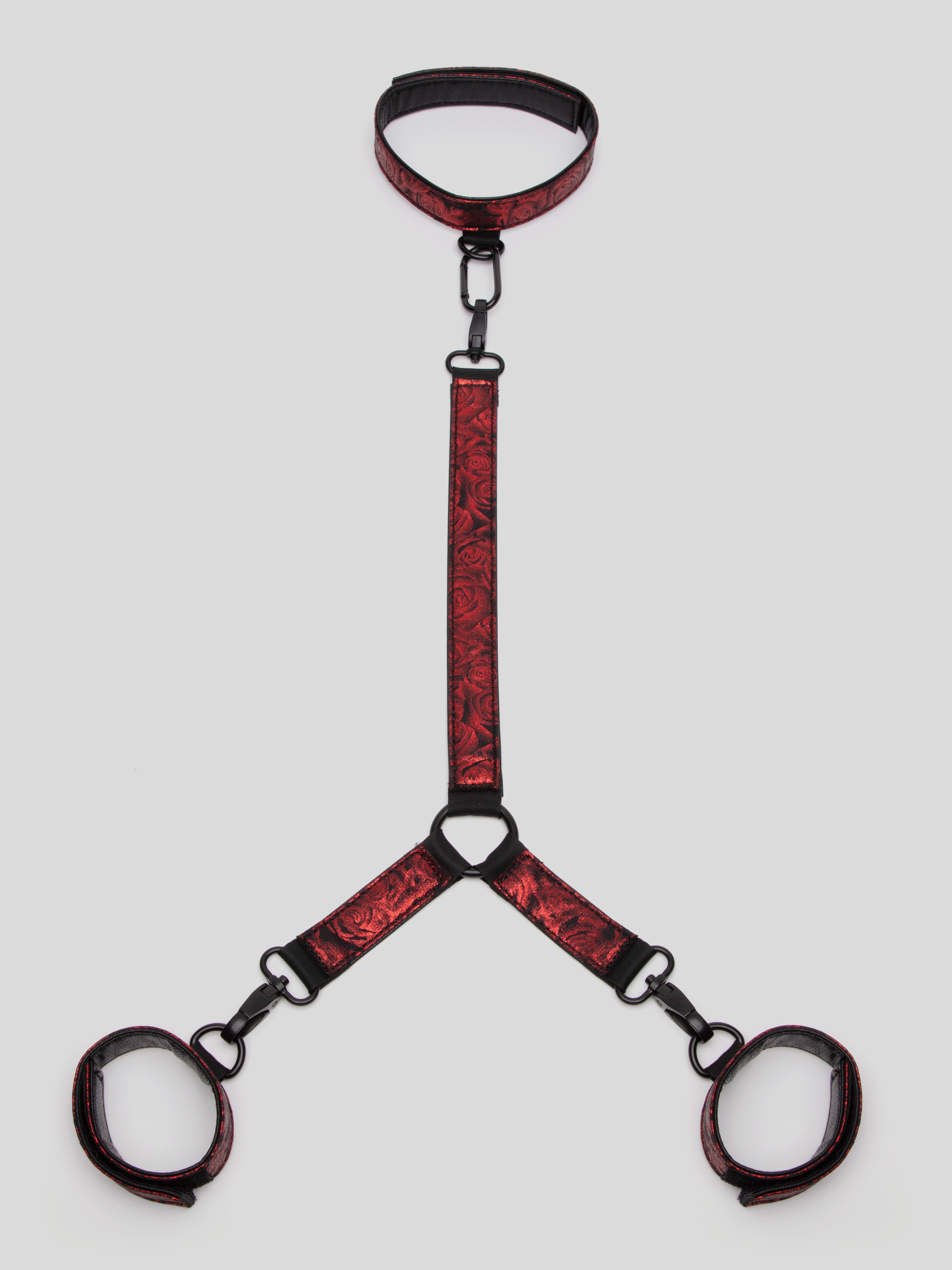 Quick-release chain connectors and D-rings on the cuffs and collar enable a variety of restraint positions.
