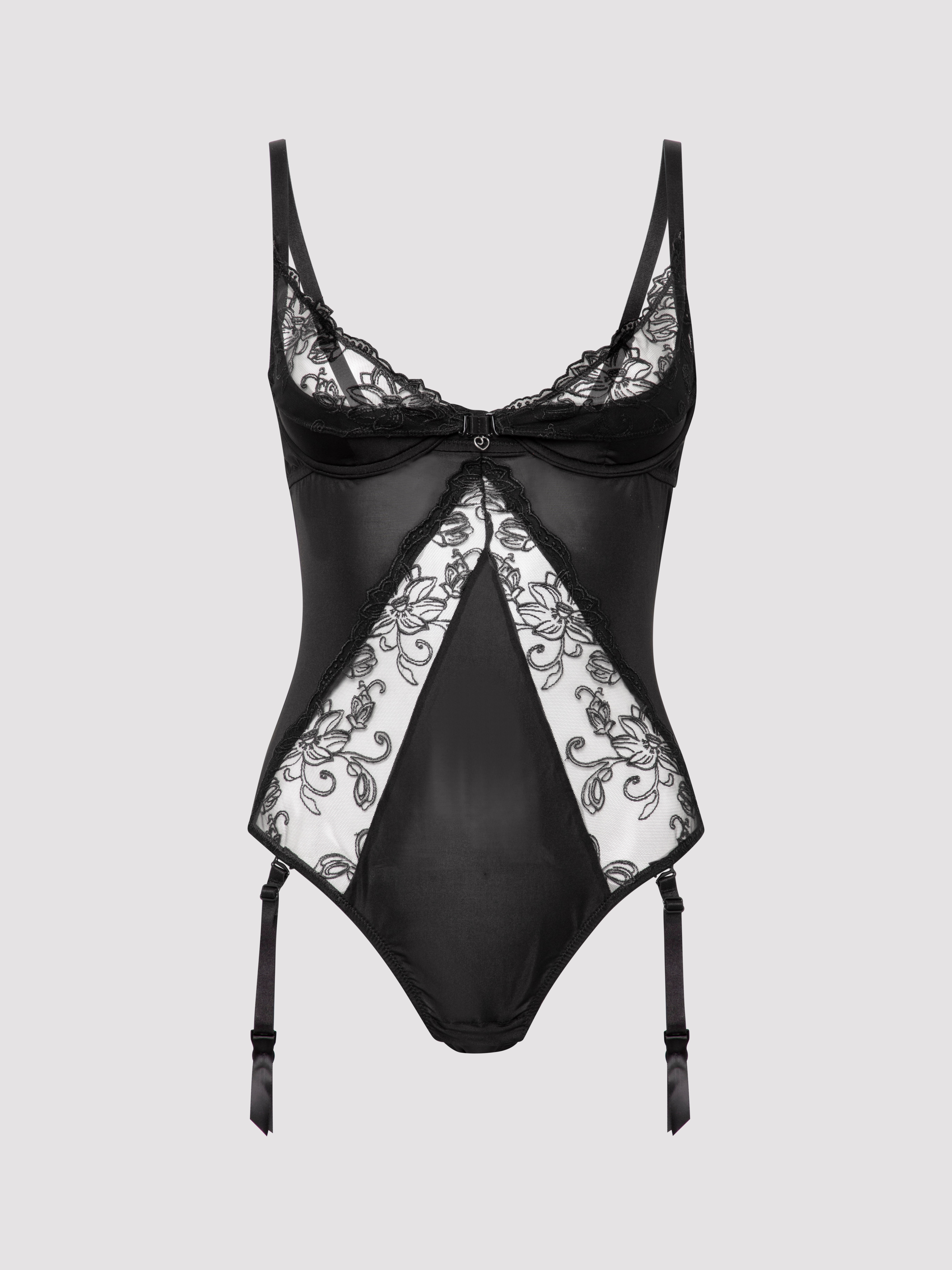 Keep it classic in this sleek embroidered body from our Lotus collection. Made from sleek black fabric and sheer floral mesh, this ultra-flattering piece shows off your curves, while quarter cups with removable sheer panels add a touch of je ne sais quoi.