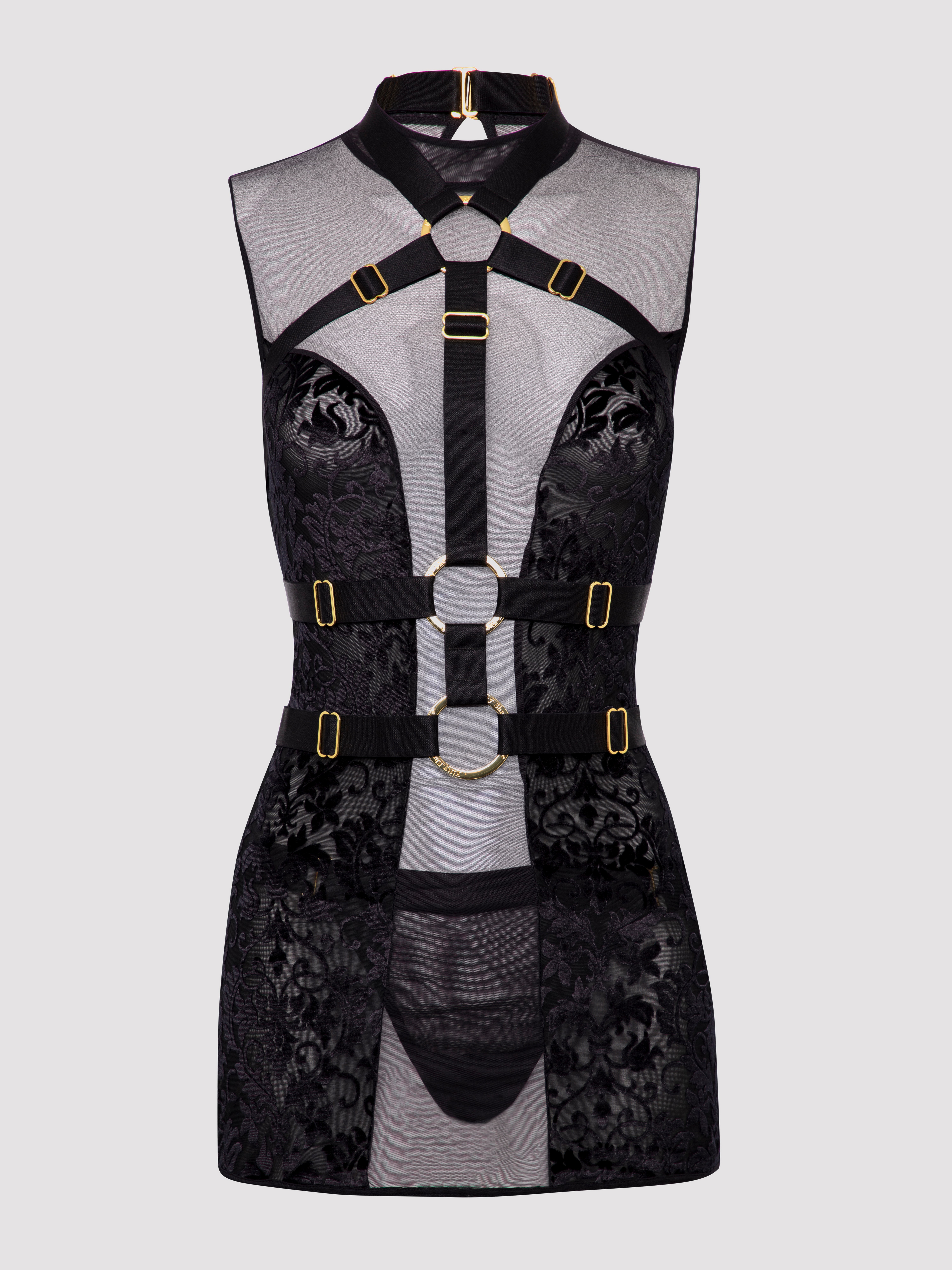 Serve opulent glamour in this fetish-inspired set. With a semi-sheer mini dress and a removable harness, the fierce duo is three show-stopping looks in one. Wear each piece on their own, or put them together for stunning, high fashion boudoir couture.