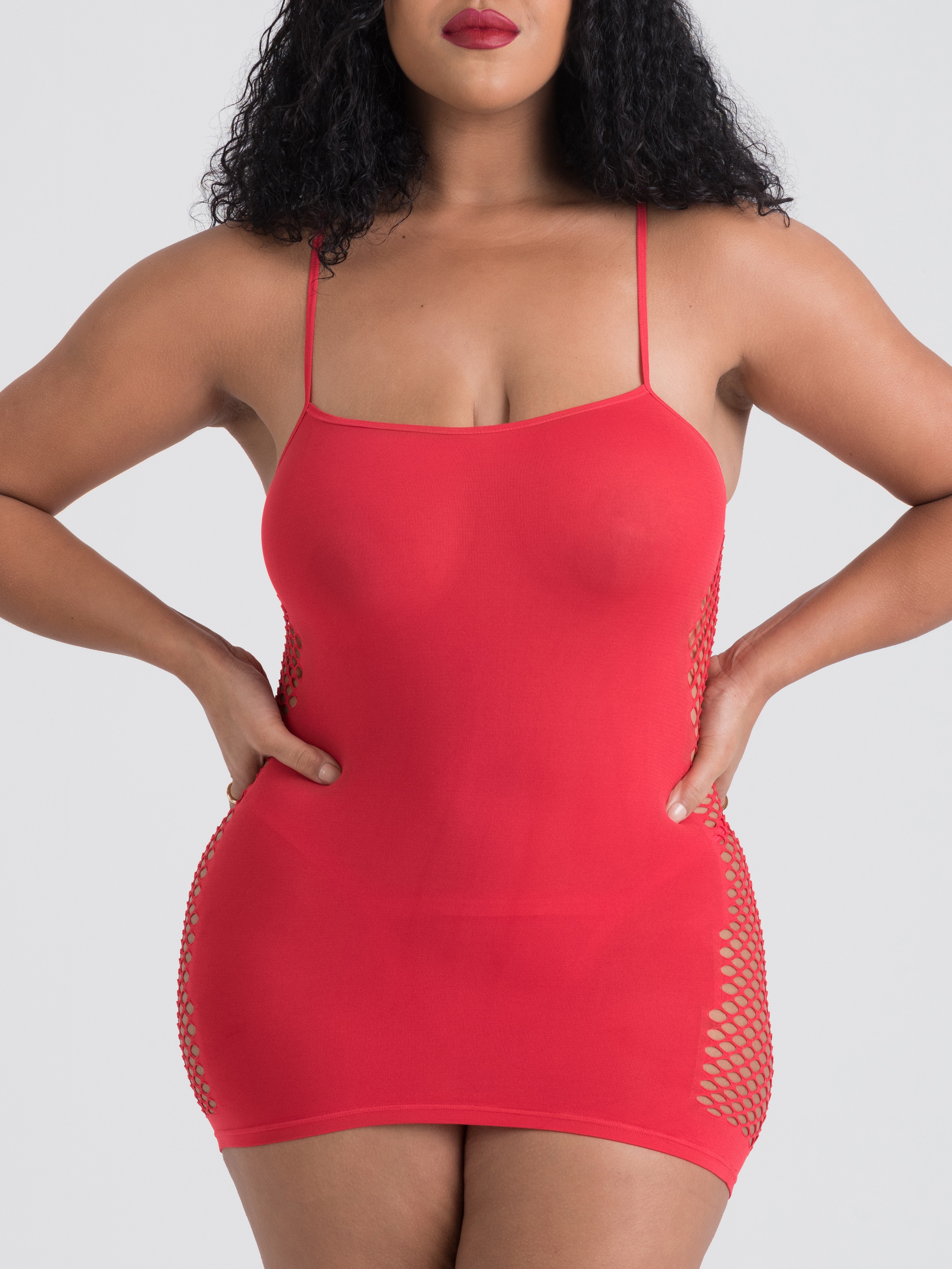 For an optical illusion that will wow both you and your partner, slip into our slinky scarlet mini dress to discover magically enhanced curves. An opaque front edged with sexy sheer fishnet creates the look of a smaller waist, and fuller boobs and hips.