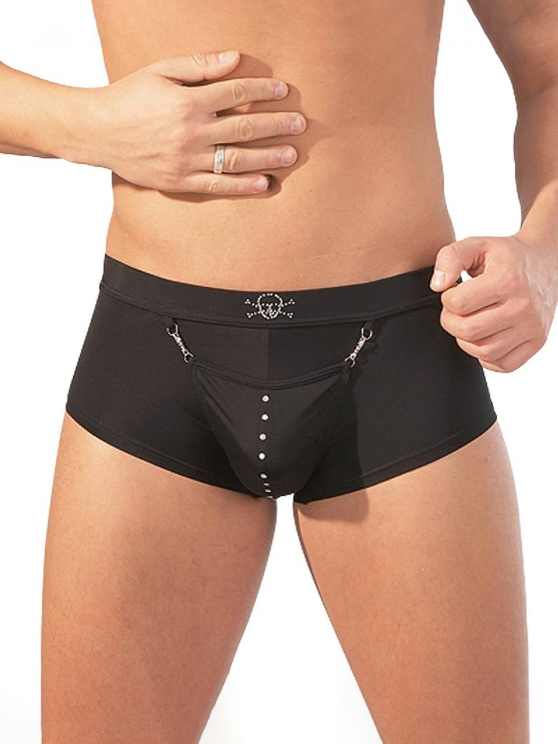 Get the full package with these racy penis-enhancing boxers, complete with built-in cock ring. Glittering diamanté and metal details add sexy sparkle and fetish appeal, while the skull and crossbones is enough to make any seafarer jump to your ship.