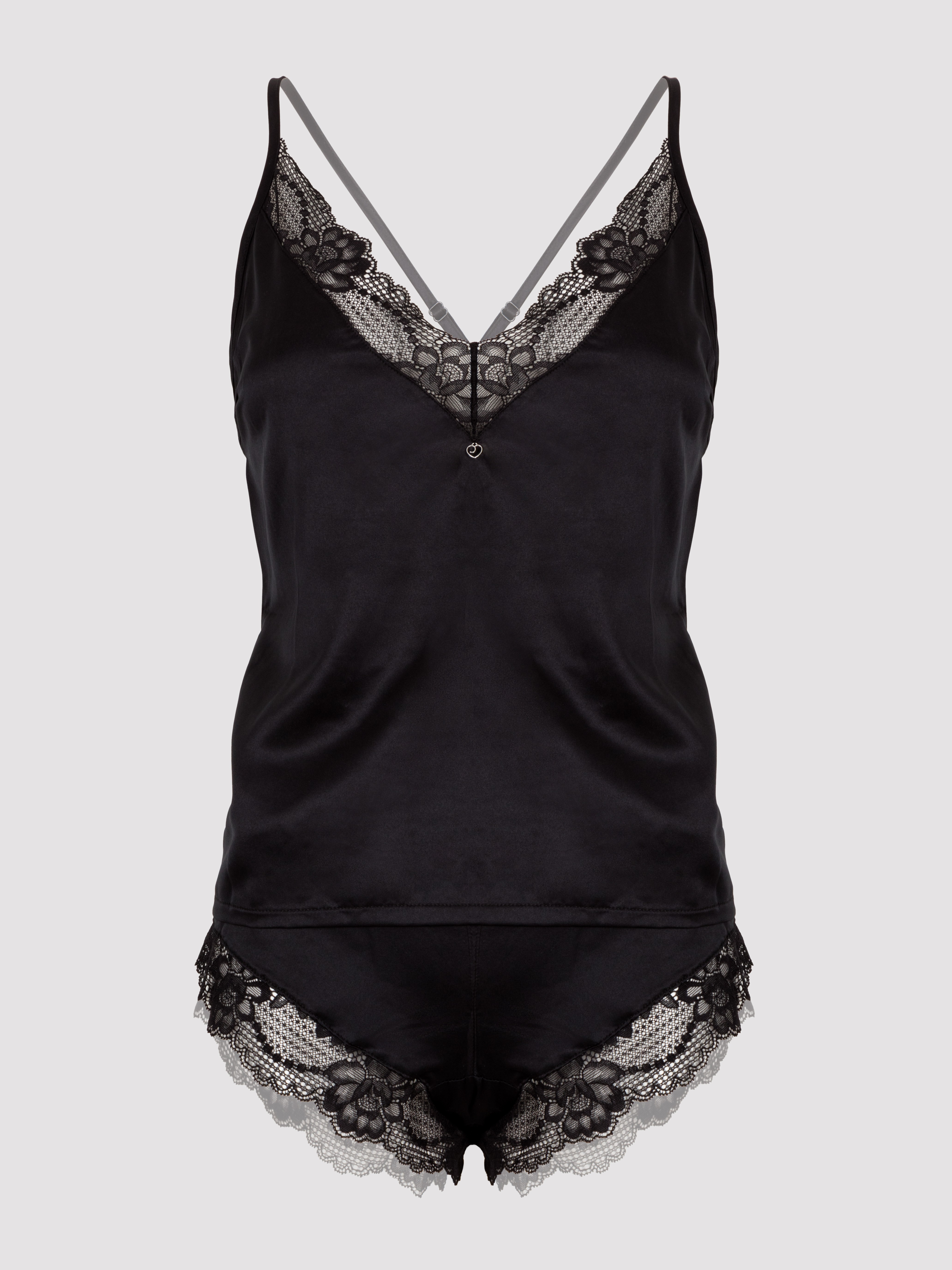 Go over to the dark side with this elegant black satin cami set. Made from luxurious-feeling fabric with sultry lace details, the plunging cami will make you feel like a badass princess, while the matching shorts show off your booty when you spin around.