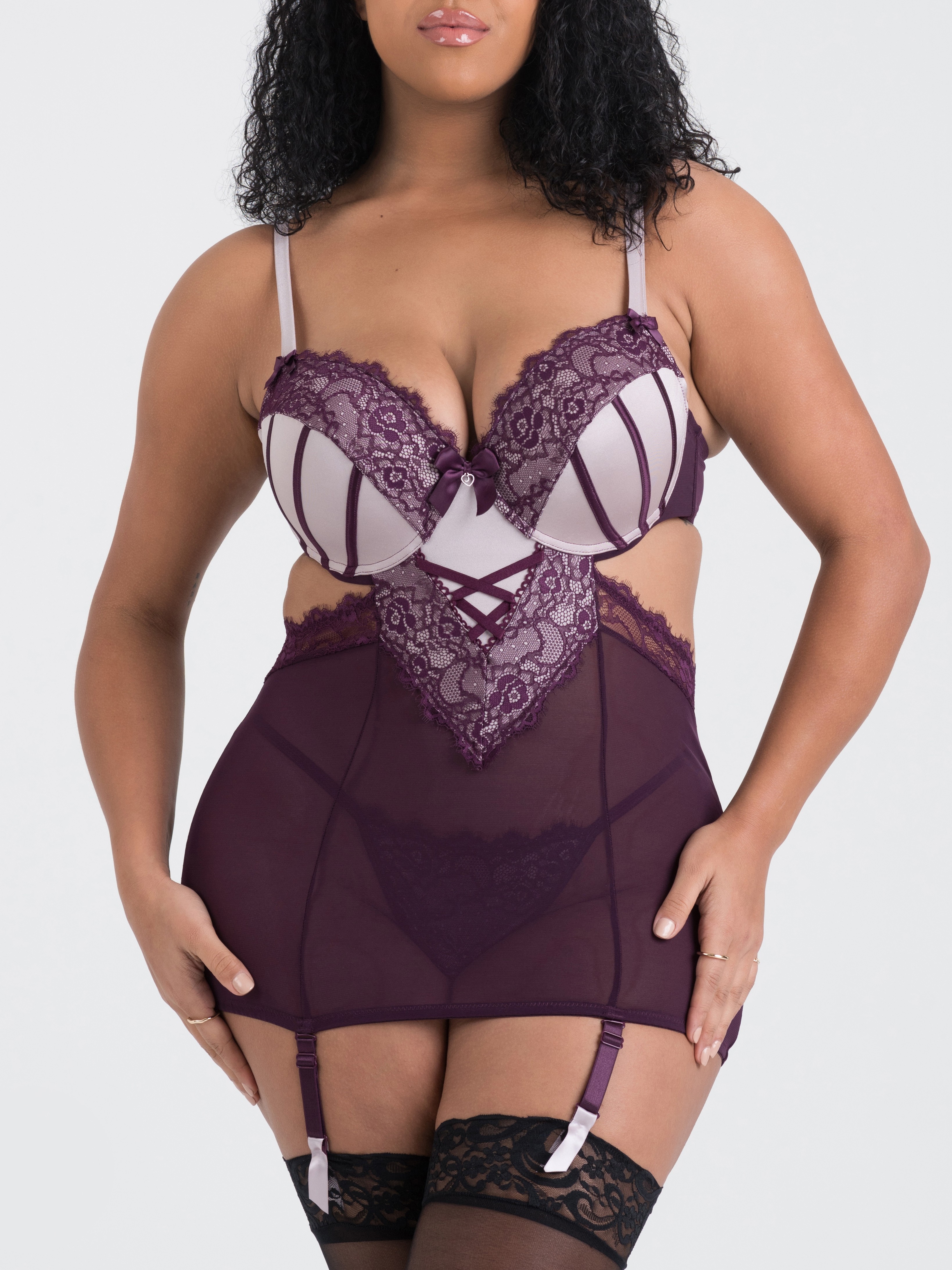 Cut-outs reveal plenty of skin to the sides, while the scoop back leads down to criss-cross strapping that emphasises the curve of your bottom. To finish your achingly sexy look, ribbon-trimmed suspender straps lead down to your favourite stockings.