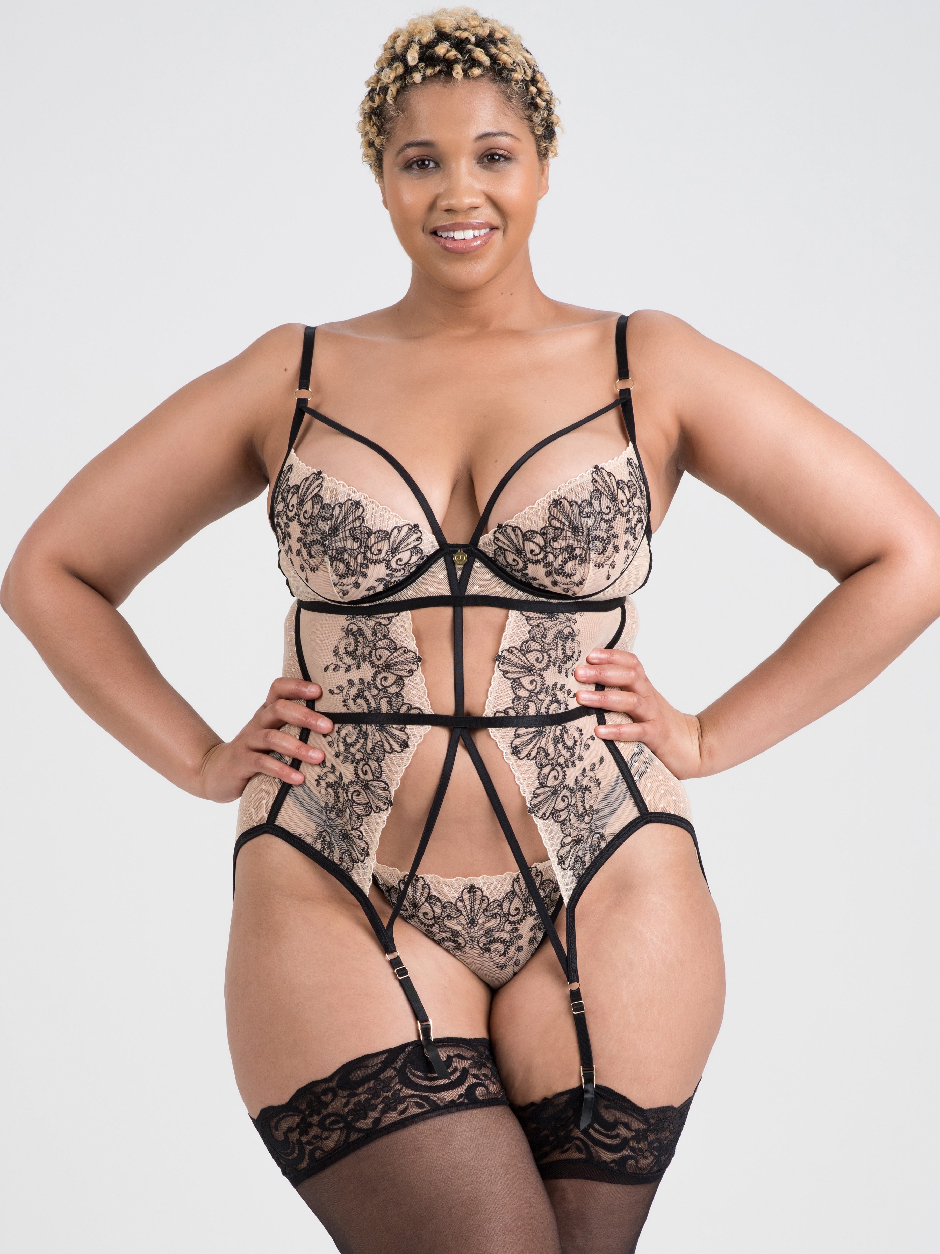 Lovehoney Plus Size Siena Gold and Embroidered Black Crotchless Bustier Set