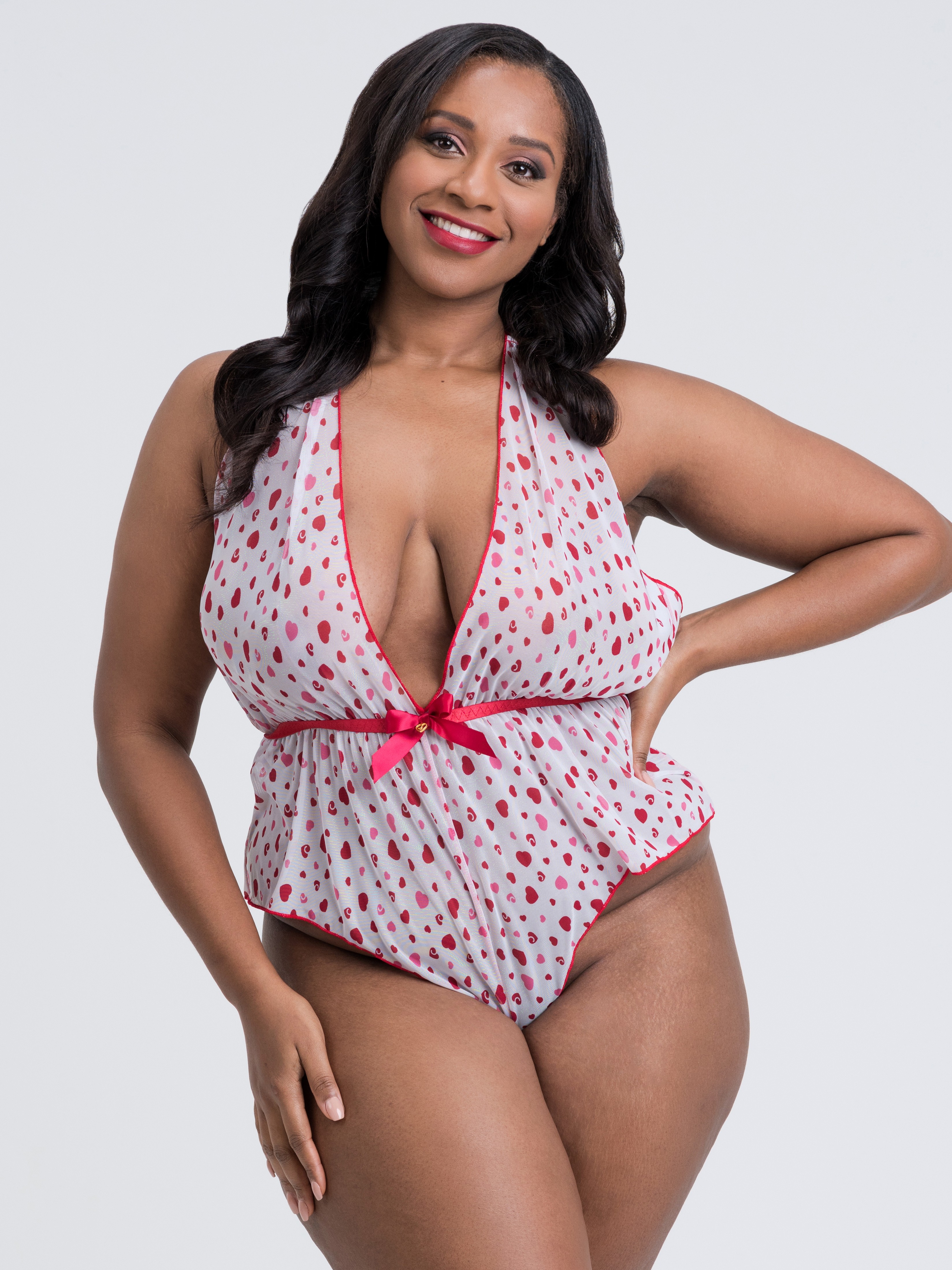 Create curves to fall in love with in this gorgeous, barely there body. With pink and red Lovehoney hearts scattered on sheer white fabric, a deep plunging neckline and a super-high-cut leg, this unbelievably sexy all-in-one will set hearts pounding.