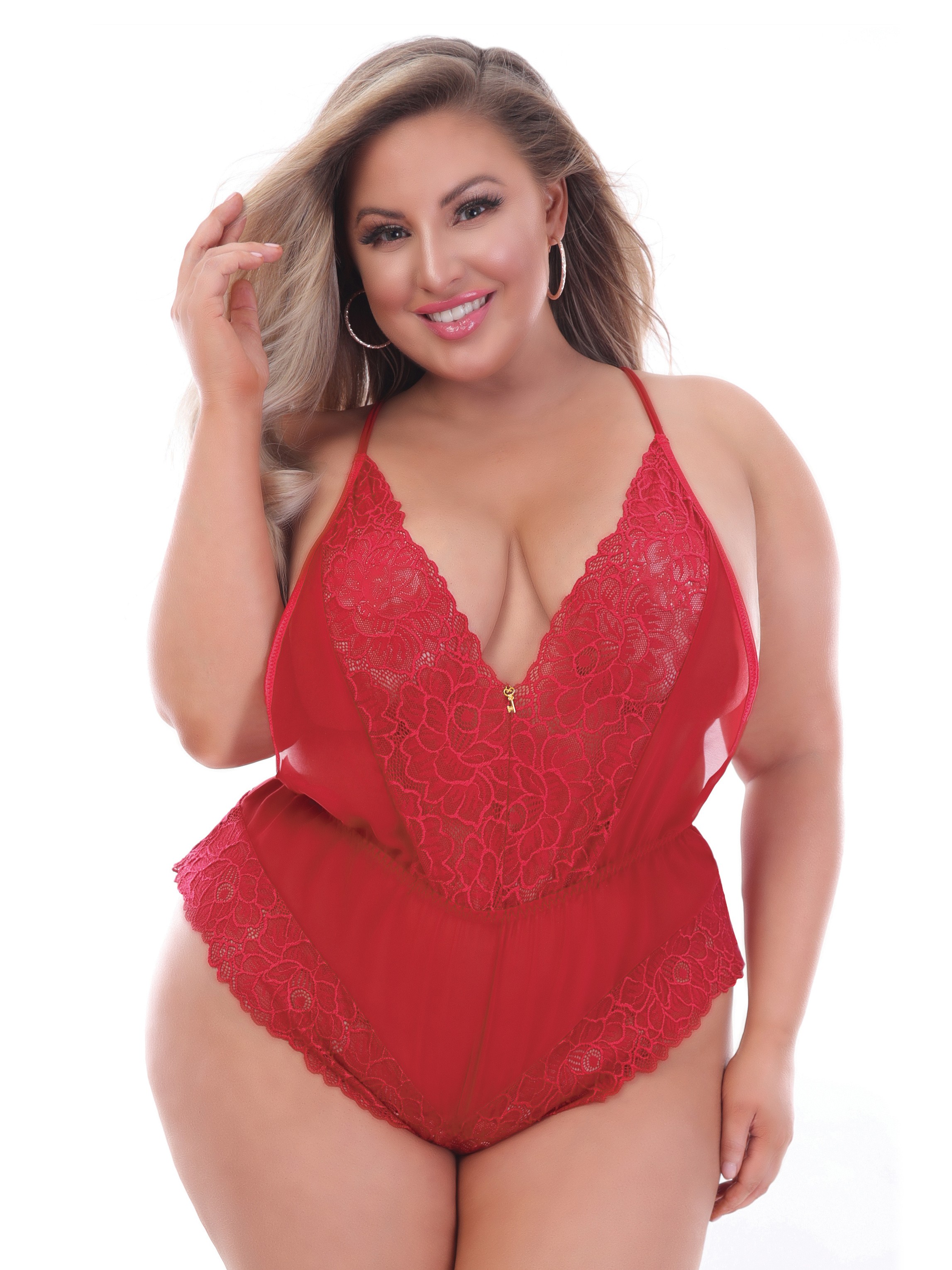 Seven 'til Midnight Plus Size Red Chiffon and Lace Teddy