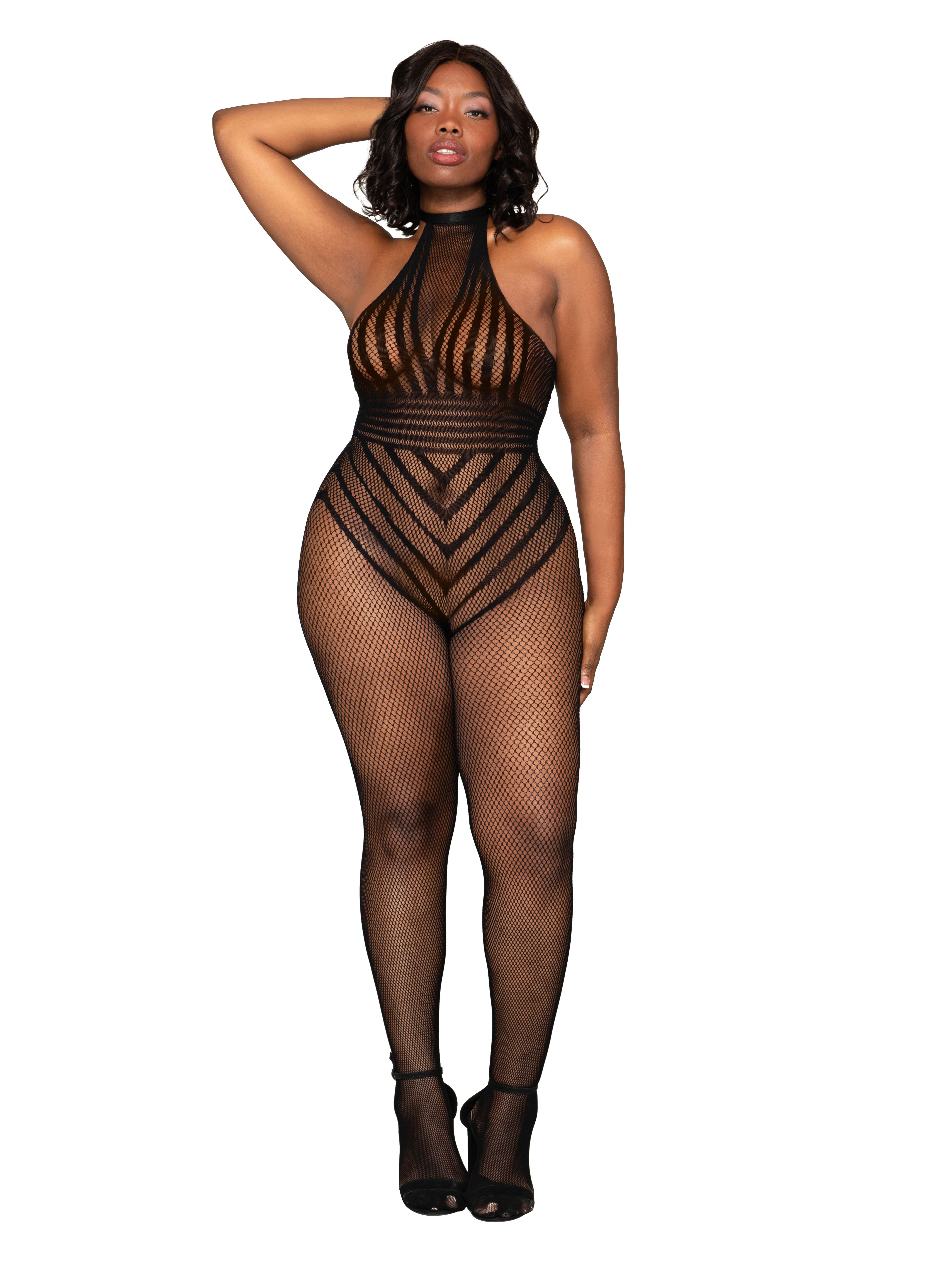 Dreamgirl Plus Size Crotchless Fishnet Striped Halterneck Bodystocking