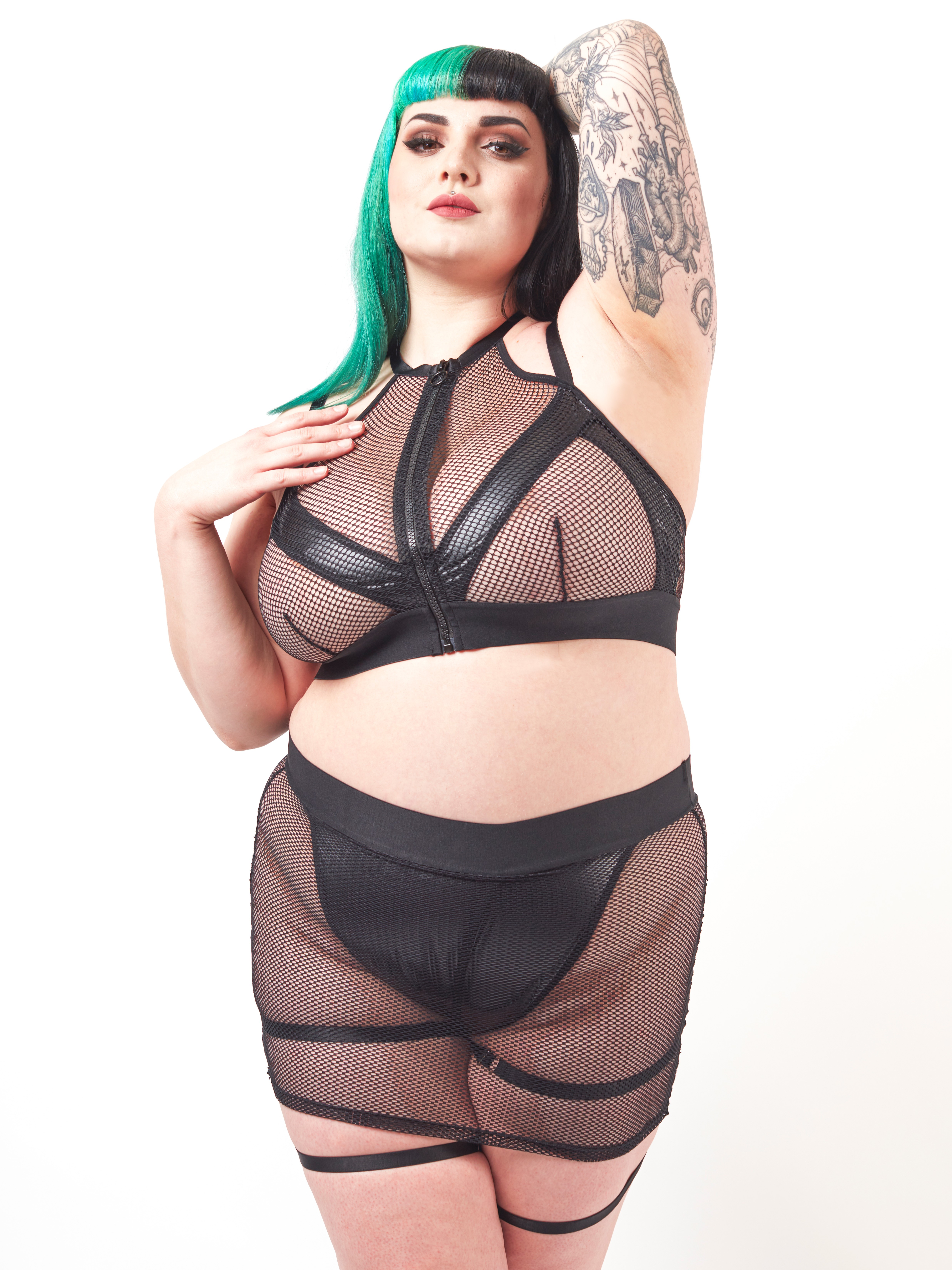 - Fishnet and wet look bra and skirt set for a bold BDSM look