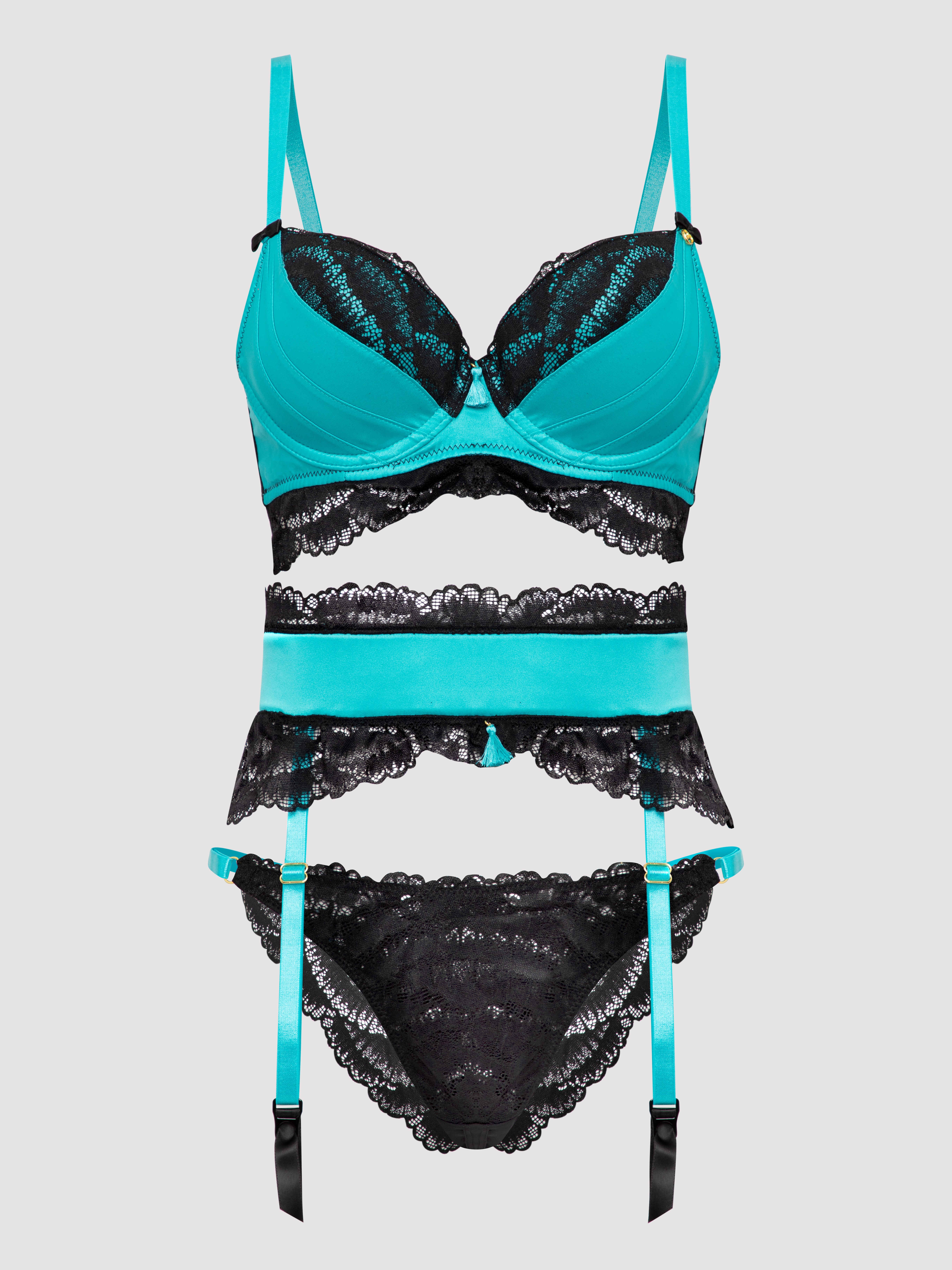 If you have a taste for turquoise, this beautiful bra set is sure to set your heart racing. A delicious concoction of ocean-blue satin and delicate black lace, it’s designed for after-dark seduction. Add stockings to take this look from sexy to sizzling.