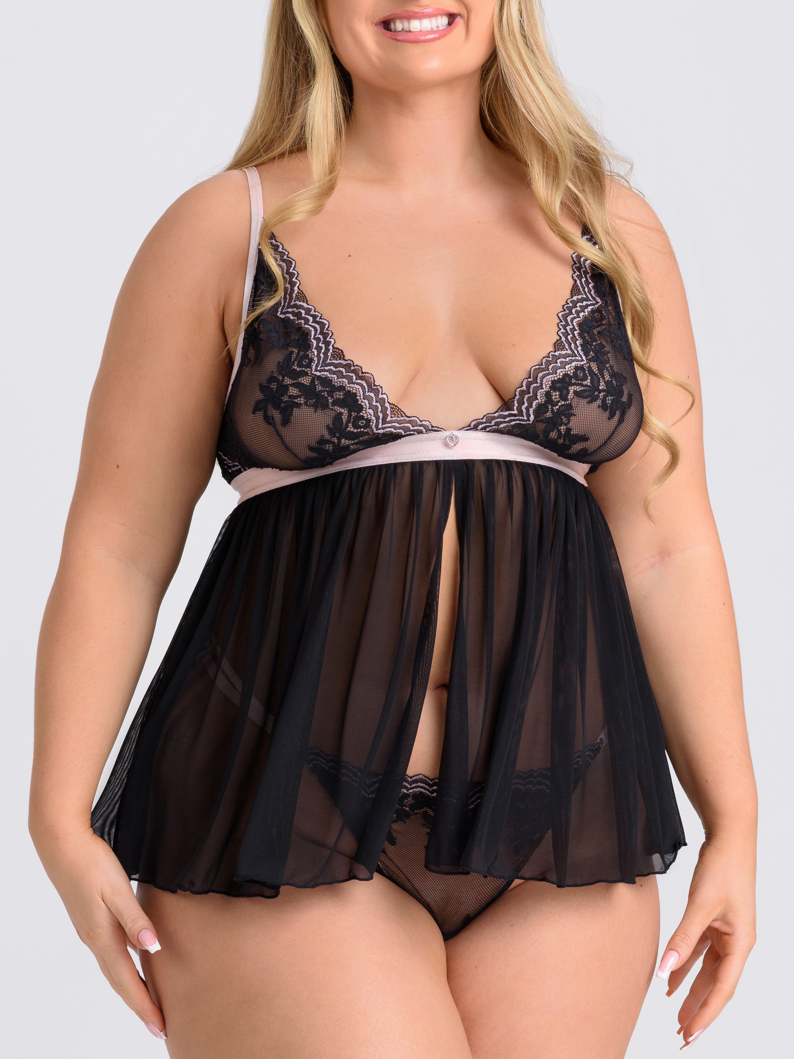 Adding a beautiful finish to your bedroom get-up, and shyly hidden beneath the sheer mesh front sits a double-strapped thong to make your intimate invite even more irresistible.