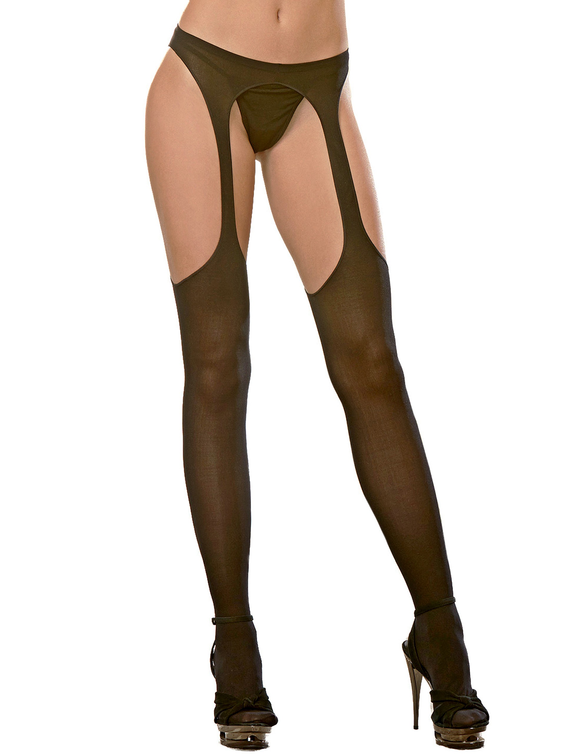 - Suspender style leaves the crotch open for intimate play