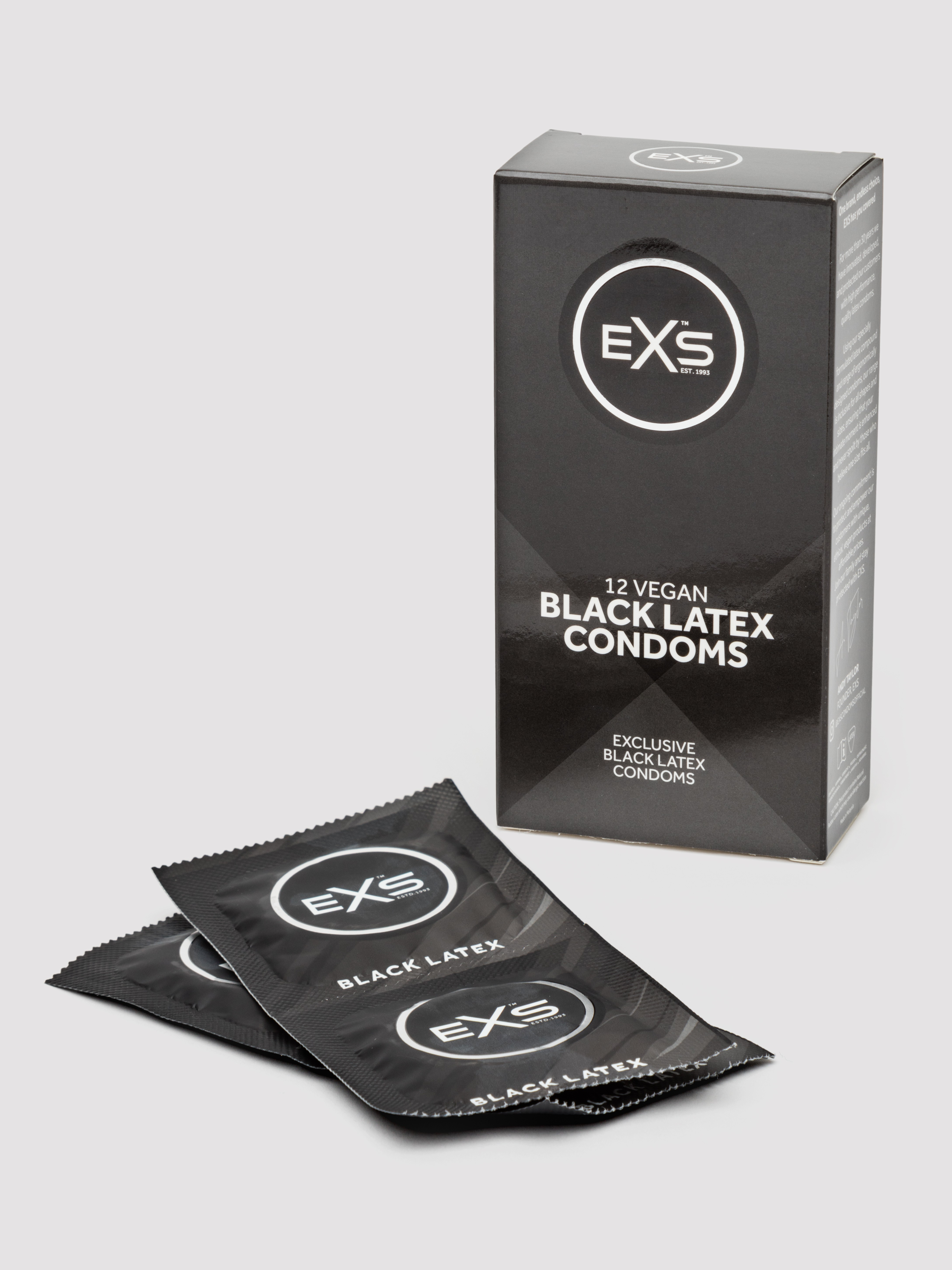 - Pack of 12 x vegan-friendly, black, latex condoms for a dark, seductive shine