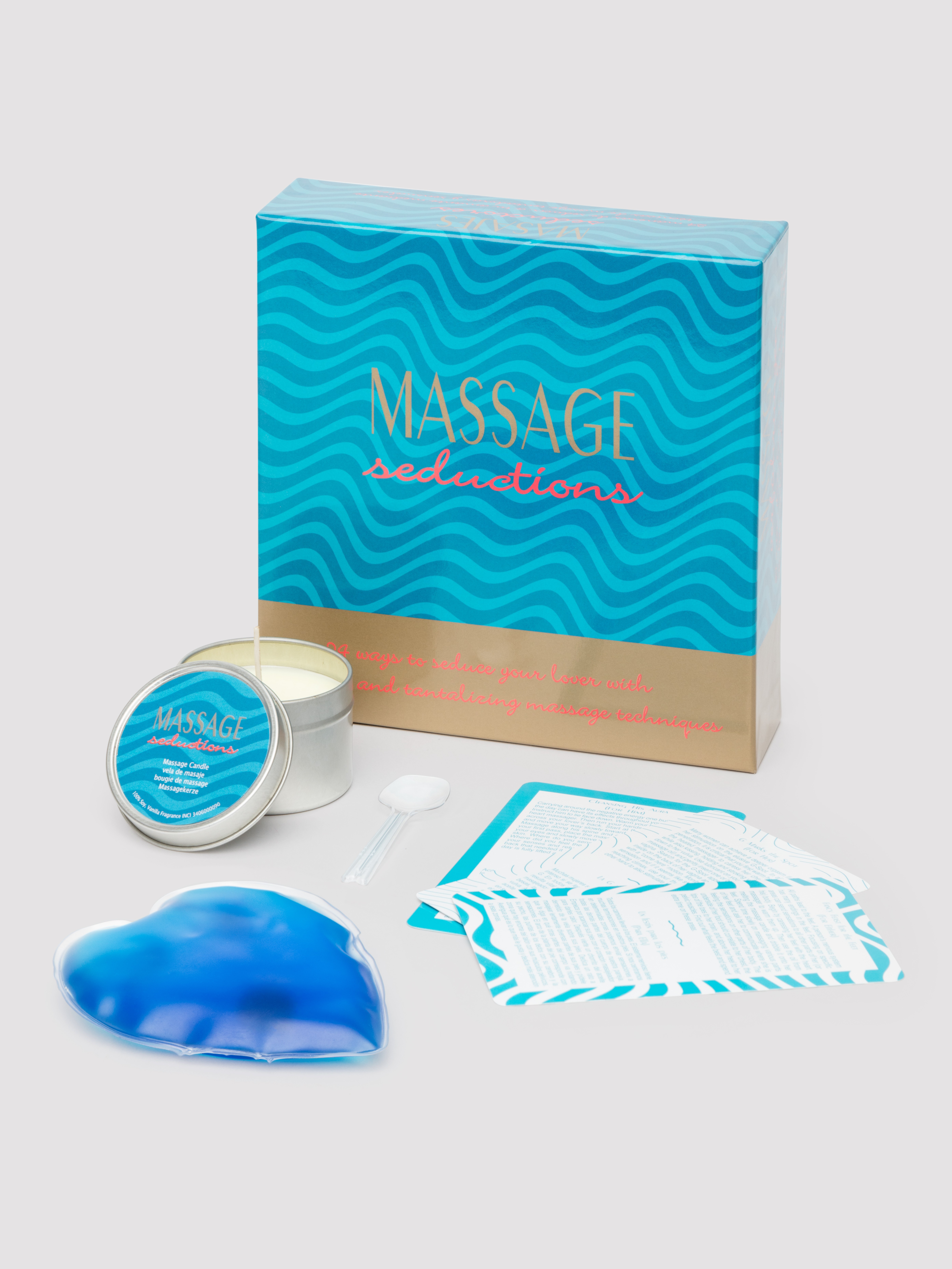 Contents include: 24 Massage Seduction cards, 1 Massage Candle (Melts to create Massage Lotion), 1 Spoon, 1 Warming Heart Massager, Helpful Tips, and an Instruction Guide.