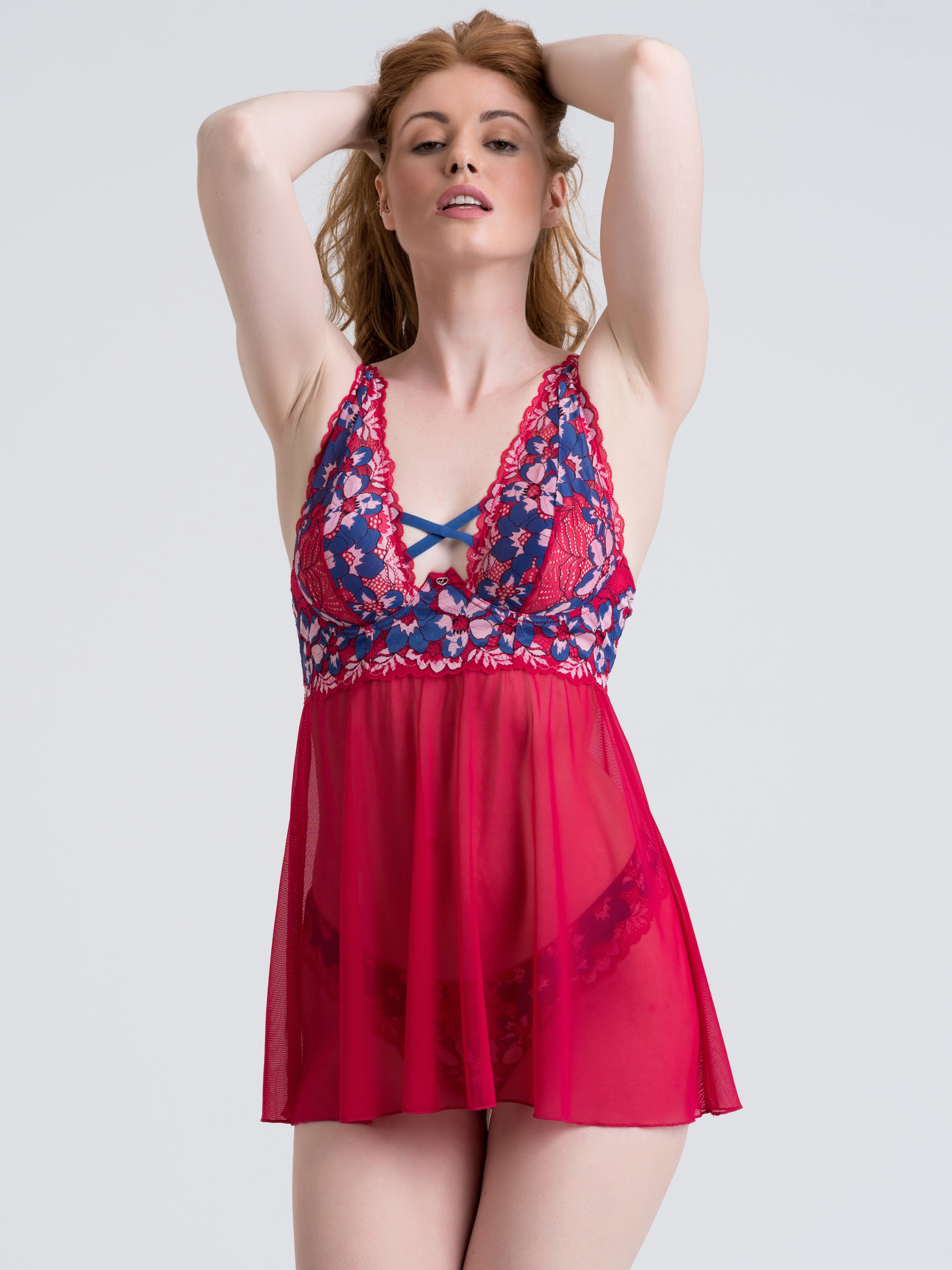 Made from beautiful ruby-red mesh with cornflower blue and rose pink accents, this set is a refreshing alternative to traditional black lingerie. But don’t be fooled – while the babydoll is pretty it’s still bursting with sex appeal.