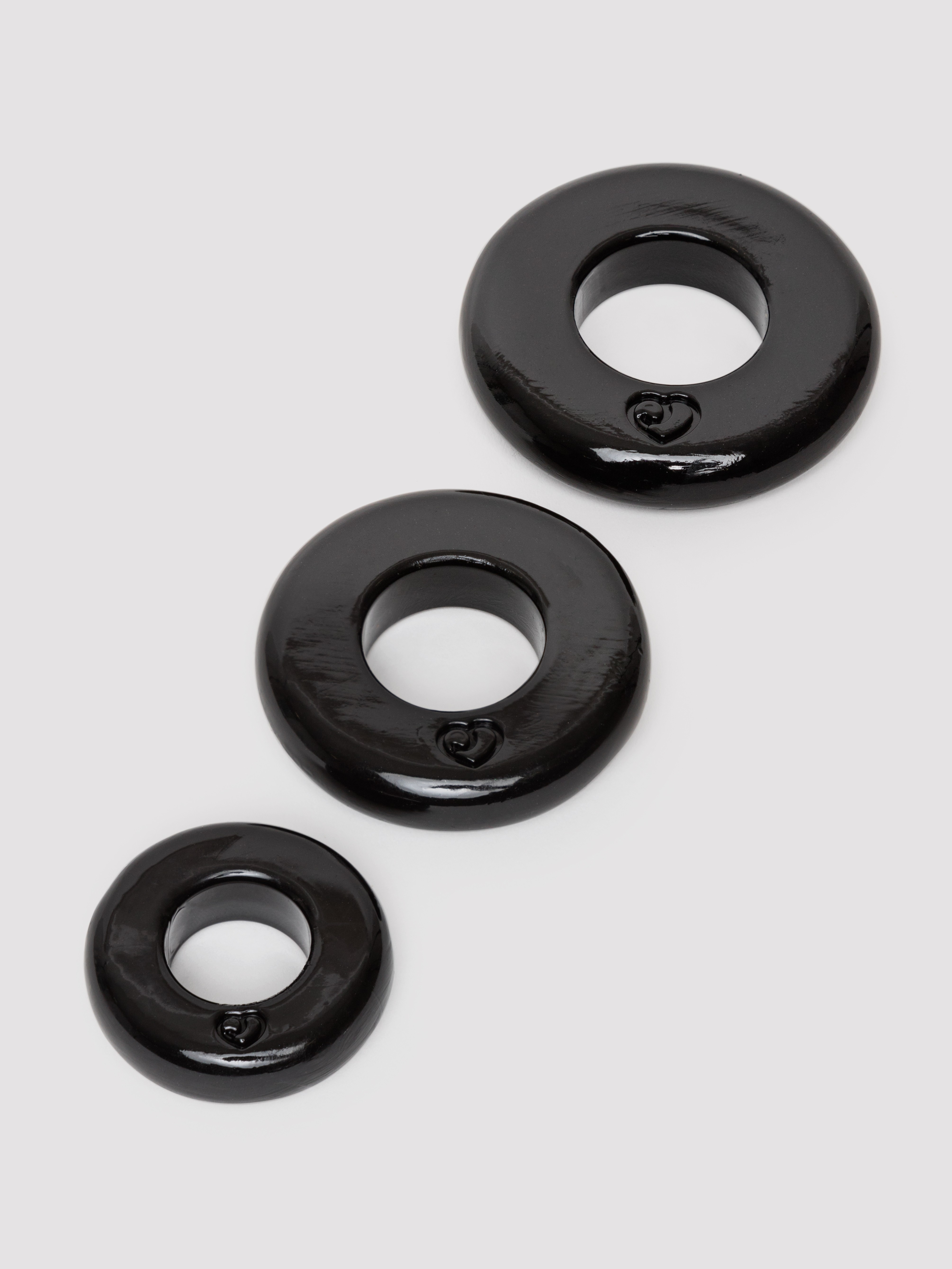Variety is yours with this set of 3 black doughnut-shaped stamina rings. Each different sized ring is super-stretchy, squishy and body-safe, and can be worn individually or all together for varied sensation and stamina. Suitable for beginners.