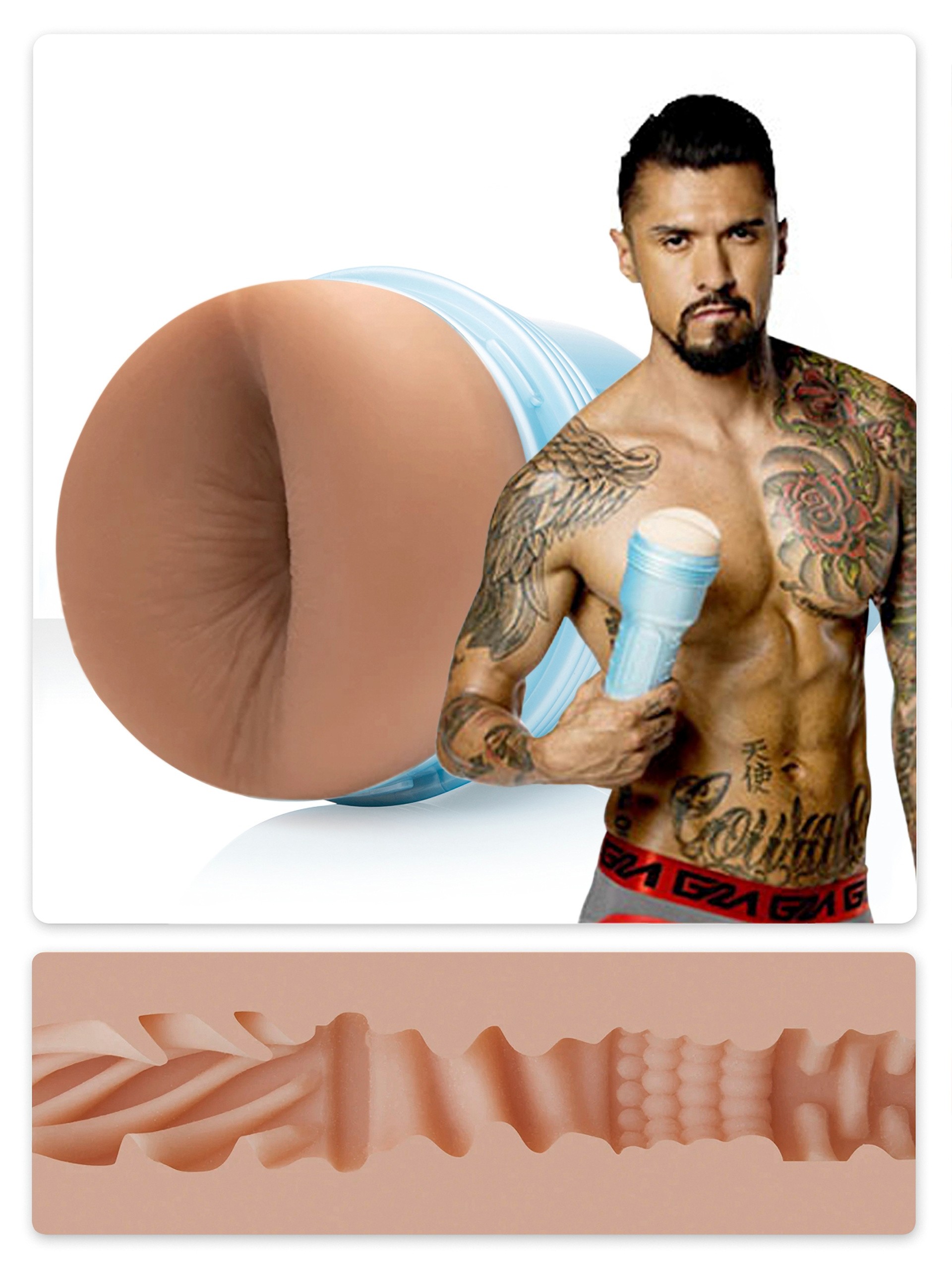 Boom, clap! Plunge into sex god Boomer Banks' unique Fleshjack texture and revel in a spine-tinglingly tight, textured canal lined with tantalising swirls and bumps. It won't get you off faster than the speed of sound, but hey, there's no harm in trying.
