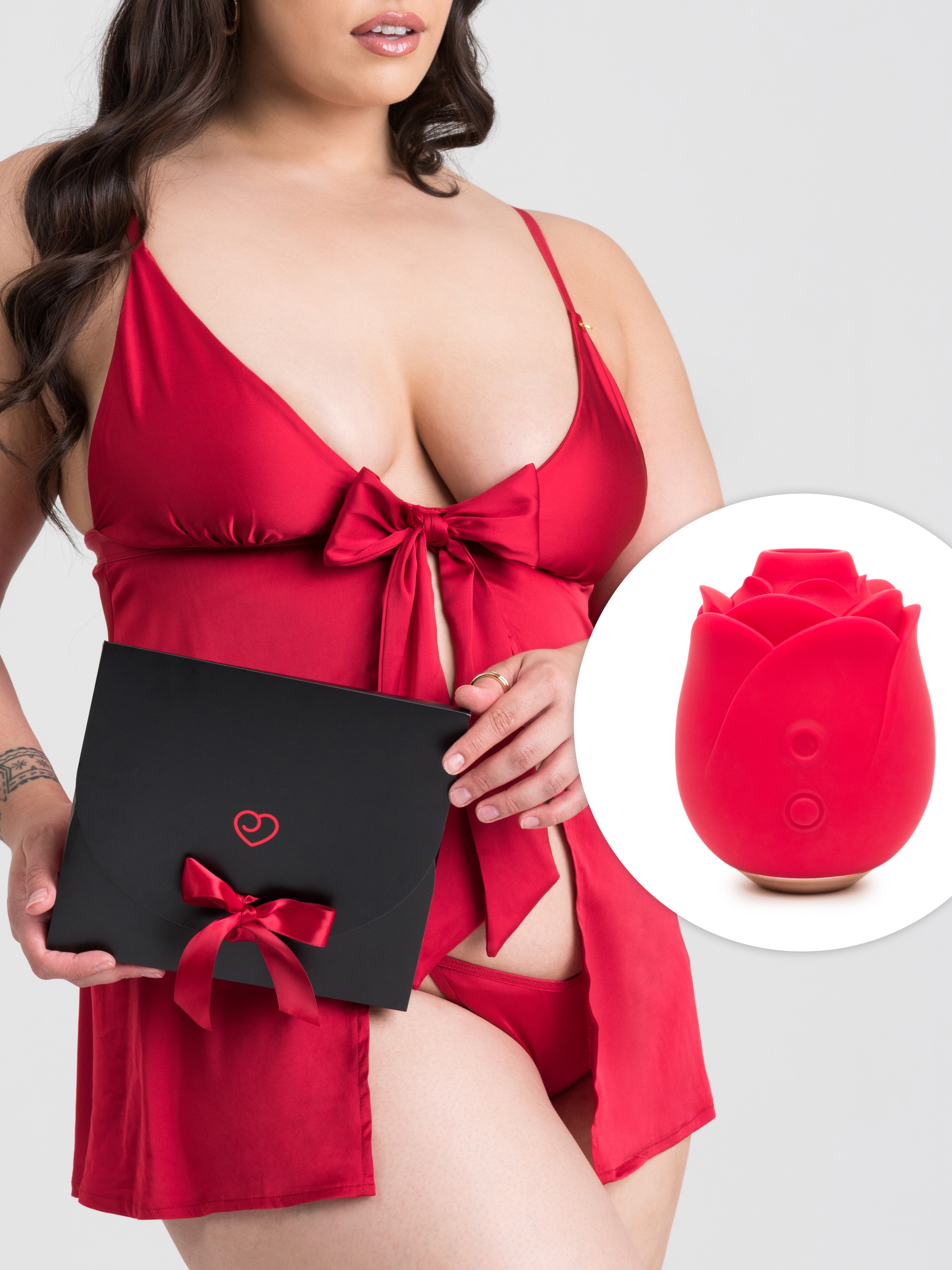 Perfect for gifting, this sexy bundle has got you covered. Featuring the gorgeous Lovehoney Unwrap Me Red Satin Baybydoll and the Lovehoney Rose Clitoral Suction Stimulator, this set will have you sizzling all season long.